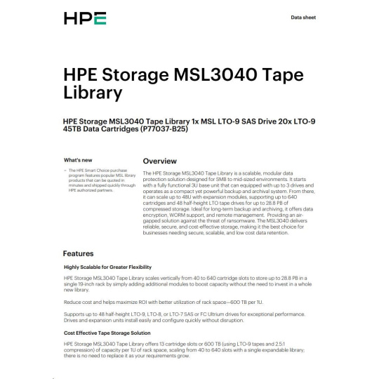 HPE Storage MSL3040 Tape Library 1x MSL LTO-9 SAS Drive 20x LTO-9 45TB Data Cartridges.