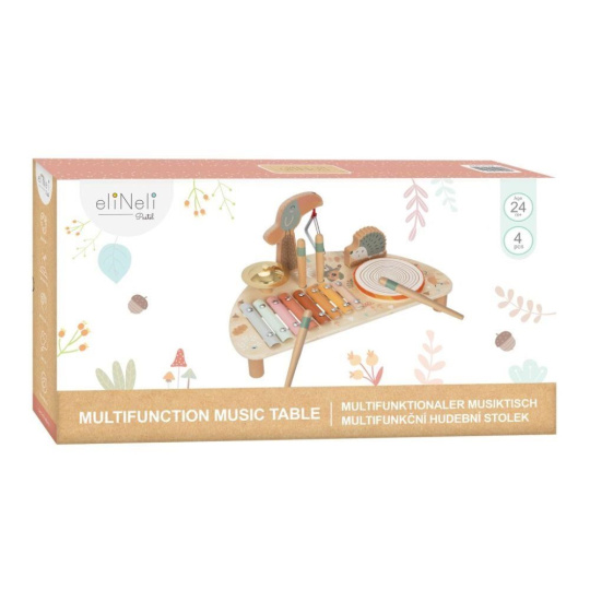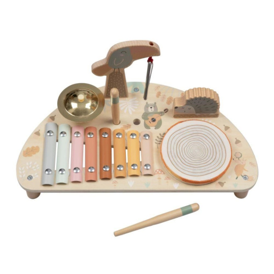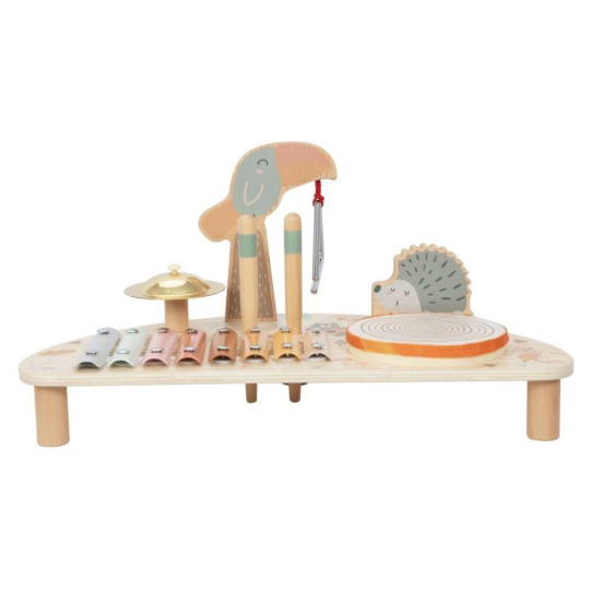 Dřevěný hudební stoleček pro děti se sadou 5 hudebních nástrojů na jednom místě, s krásnou malbou a se zvířátky z lesa, probudí lásku k hudbě v každém dítěti. Hudební stoleček obsahuje základní dětské hudební nástroje, které stimulují smysly, zdokonalují jemnou motoriku, seznámí děti s tím, jaké zvuky který nástroj vydává, jak se na něj hraje..