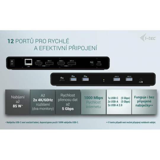 Poznámka: USB-C nabíječka není součástí dodávky. Dokovací stanici lze používat bez nabíječky, nebo s nabíječkou dodanou např. s vaším notebookem, případně lze nabíječku zakoupit samostatně, například i-tec CHARGER-C100W. Alternativně můžete zakoupit produktovou sadu CADUA4KDOCKPDB100, který již obsahuje napájecí zdroj.