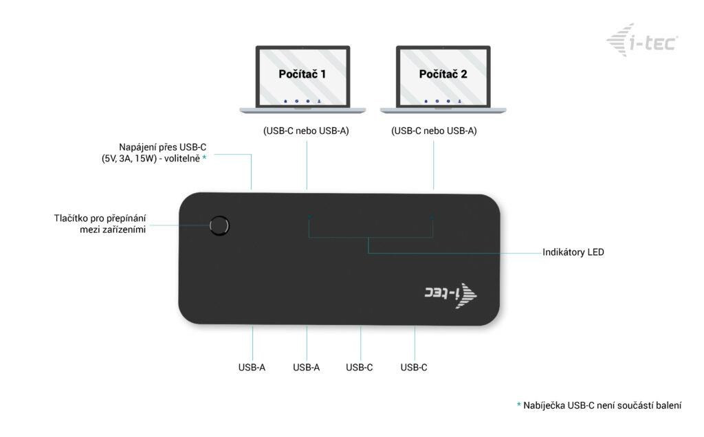 Pokud potřebujete připojit USB zařízení a periferie ke dvěma počítačům a chcete je dokonce mezi nimi sdílet, našli jste ideální řešení. Tento HUB vám dodá další 4 porty USB (2x USB-A a 2x USB-C), které můžete snadno – stisknutím jednoho přepínacího tlačítlka – přiřadit k počítači 1, nebo počítači 2.