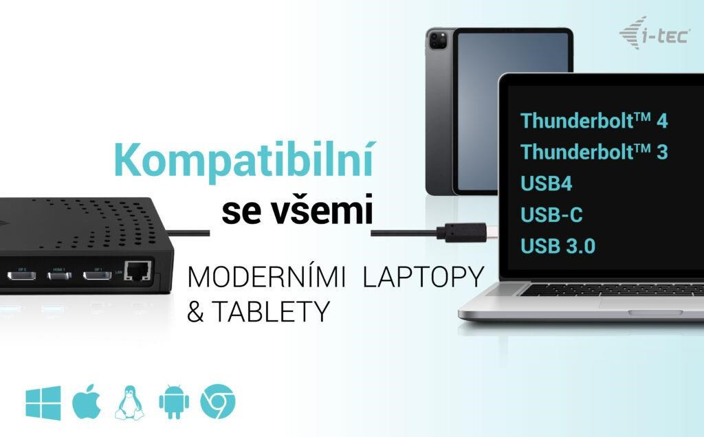 • Dokovací stanice je kompatibilní se všemi moderními notebooky (připojení přes porty USB 3.0, USB-C nebo Thunderbolt™ 3/4).