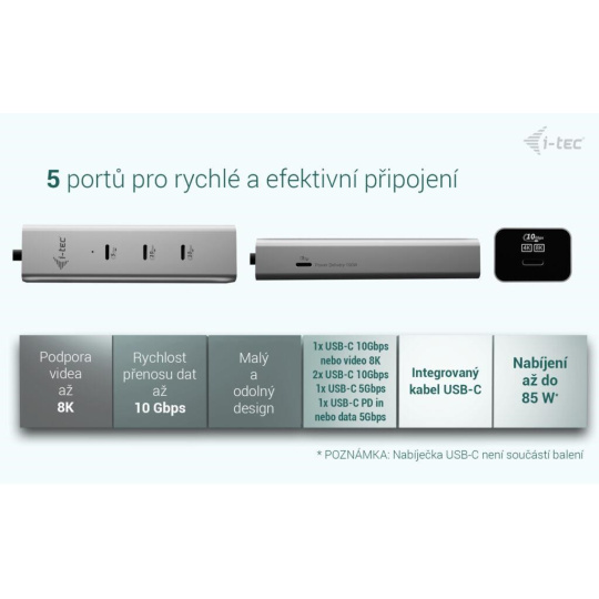 i-tec USB-C Charging Metal HUB 5port with USB-C video 8K + Power Delivery 85W