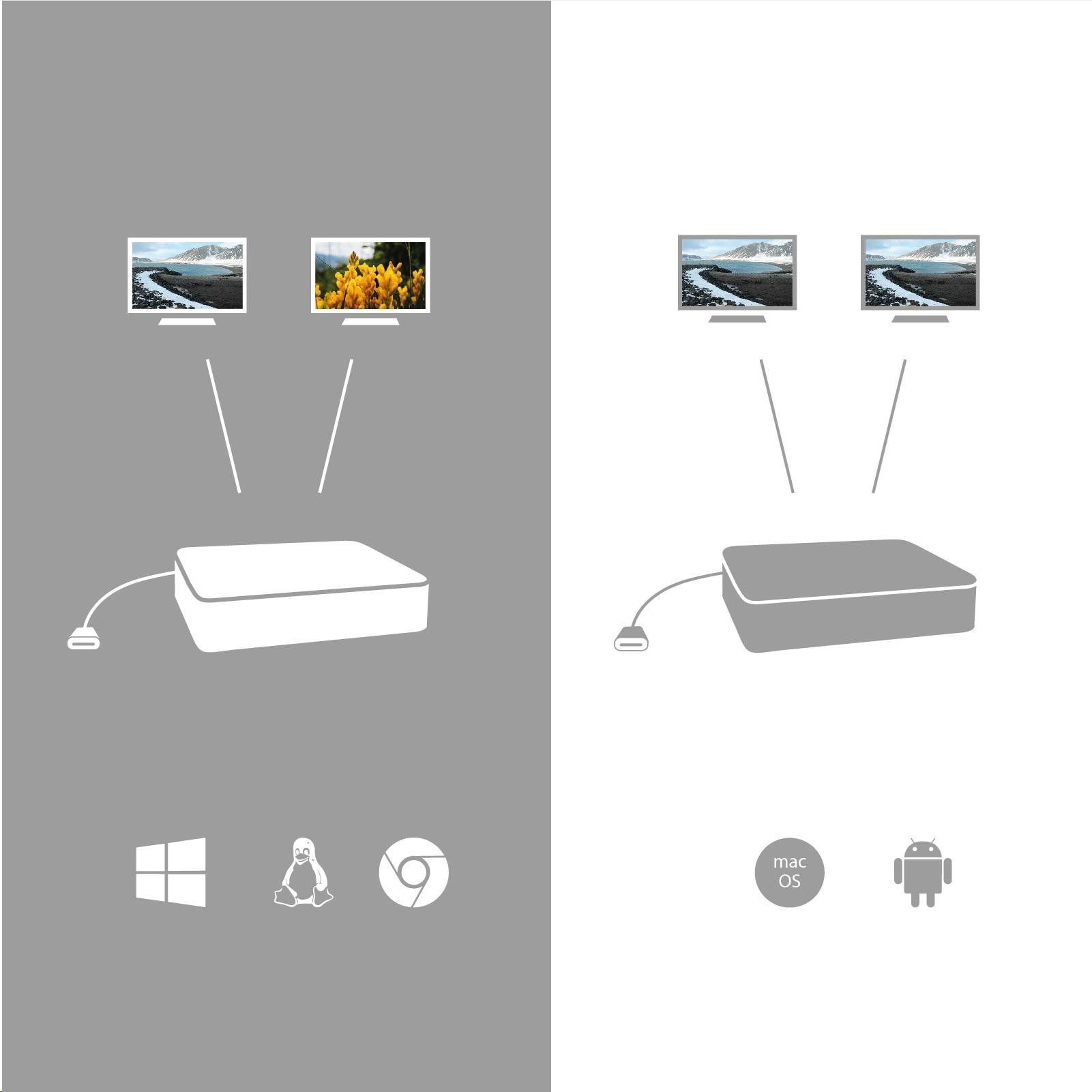Poznámka: operační systém macOS nepodporuje technologii více obrazového video přenosu Multi Stream Transport (MST), což znamená, že v případě připojení k macOS bude na obou připojených monitorech promítnut stejný obraz.