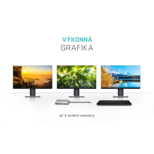 * Vezměte prosím na vědomí, že možnost připojit tři externí monitory záleží na grafické kartě vašeho notebooku, ačkoliv většina současných grafických karet (včetně integrovaných karet Intel) toto zvládá. Nicméně, pro video výstup na tři monitory musí být víko vašeho notebooku zavřené.