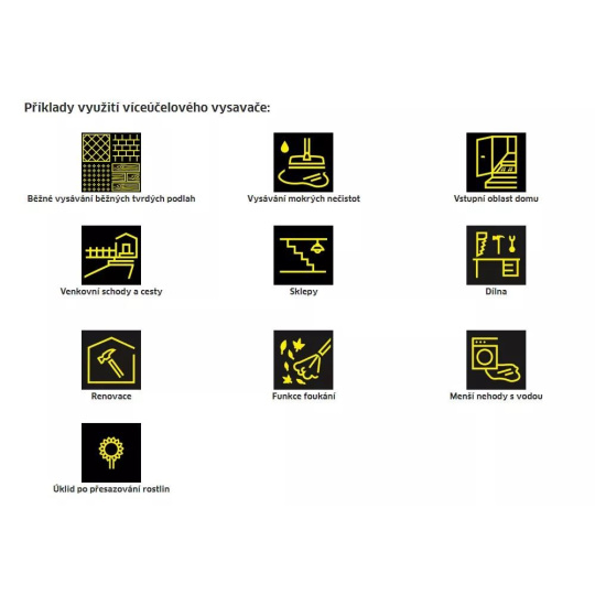 mokré, jemné nebo hrubé nečistoty se spotřebou 1100 wattů. Zařízení je dodáváno s robustní plastovou nádobou o objemu 25 litrů, 5metrovou šňůrou, 2,2metru dlouhou sací hadicí s odnímatelnou,