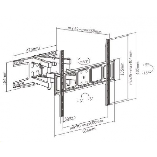 Kvalitní nástěnný držák na televizi Fiber Mounts Solid-2 Otočný, sklopný, výsuvný držák Tv 43-85" s pevnou a bezpečnou konstrukcí Držák vhodný pro zavěšení televize na stěnu do obýváku, pokoje nebo kanceláře. Držák Tv Fiber Mounts Solid-2 se vyznačuje kvalitní robustní konstrukcí s velkou nástěnnou plochou pro spolehlivou instalaci a umožňuje poměrně snadnou úpravu polohy televize otáčením do stran, naklápěním a vysouváním nebo naopak přisouváním ke zdi. V případě nerovností nebo nepřesné instalace držák umožňuje korigovat rovinu obrazovky. Na držák Solid-2 můžete zavěsit všechny televize s hmotností do 40kg, které mají VESA od 100x100 do 600x400 - ideální jsou televizory s úhlopříčkou 43" až 85". Barevné provedení černé, záruka 5 let. Držák na televizi, který vynikne opravdu solidní pevnou konstrukcí - otáčení Tv do stran, naklápění, vysouvání od zdi - Fiber Mounts Solid-2 Technické údaje: nosnost 40kg podpora VESA standardů 100x100 až 600x400 ideální na Tv s úhlopříčkou 43" až 85" polohování vzdálenosti od zdi od 62mm do 468mm otáčení televizoru do stran +/- 60° naklápění televizoru směrem dolů až o 15° a nahoru až o 5° úprava roviny obrazovky +/- 3° úchytky na kabeláž robustní, spolehlivá a bezpečná konstrukce snadné zavěšení televizoru na stěnu snadné polohování televizoru snadná instalace na stěnu dodáváme včetně instalačního materiálu barevné provedení černé záruka 5 let Ocelový nástěnný držák poctivé konstrukce Fiber Mounts Solid-2 Televizní držák Fiber Mounts Solid-2 podporuje VESA standardy: VESA 100x100 VESA 100x200 VESA 200x100 VESA 200x200 VESA 200x300 VESA 200x400 VESA 300x200 VESA 300x300 VESA 400x200 VESA 400x400 VESA 600x400.