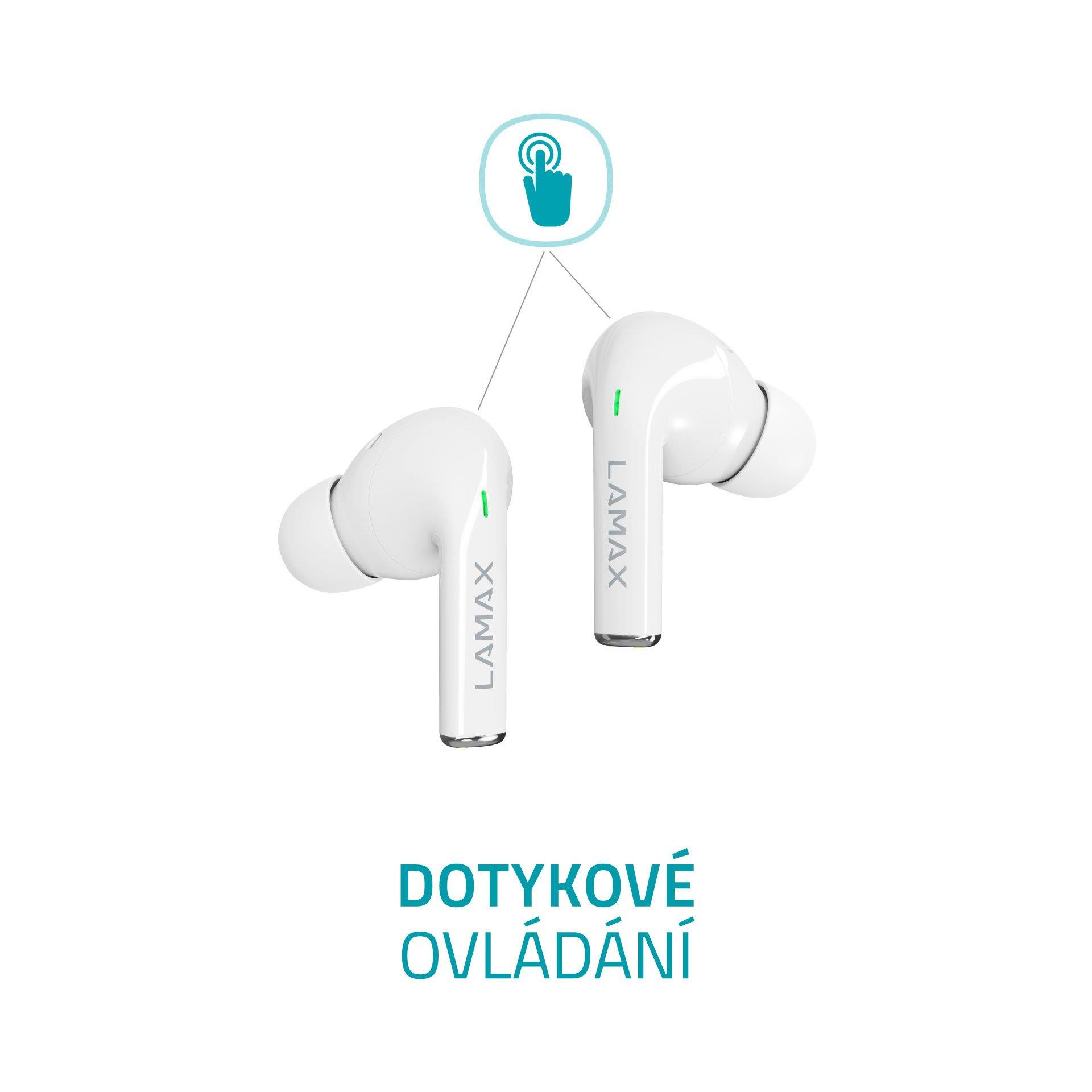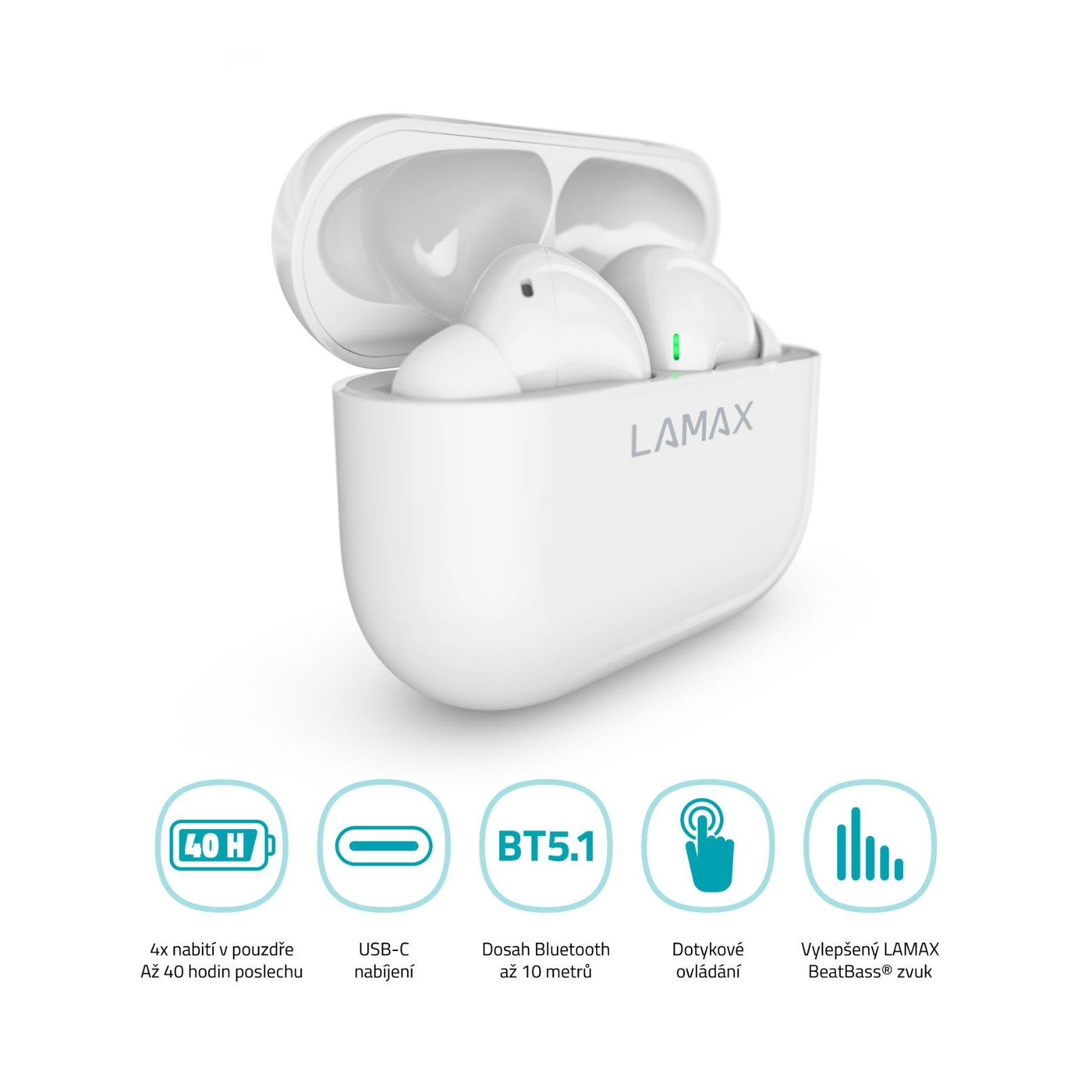 Bezdrátová TWS sluchátka, do uší, 8h výdrž/1 nabití, 40 hodin výdrž celkem, Bluetooth 5.1, dosah až 10 metrů, dotykové ovládání, USB-C, LAMAX BeatBass® technologie, automatické párování, herní režim, malé nabíjecí pouzdro, ukazatel nabíjení, kodeky AAC a SBC, podpora hlasových asistentů, náhradní náušníky..... více