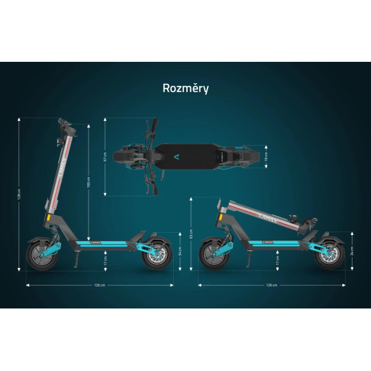 Všechny údaje o jízdě uvidíš za každého počasí nebo klidně i v noci na velkém LCD displeji, rozhodně ti proto neunikne, kolik šťávy zbývá nebo jakou máš rychlost. Hravě přes něj koloběžku pomocí 3místného PIN kódu i zabezpečíš proti krádeži. Jsou úseky, kde se můžeš kochat okolím a neřešit rychlost, tu hlídá tempomat. Když je rychlost konstantní, automaticky se aktivuje. Bezpečnou jízdu za jakýchkoliv podmínek podporuje LED osvětlení celé koloběžky, kdy díky LED světlu, bočním barevným světlům a zadnímu integrovanému budeš nepřehlédnutelný. Když s tebou jde kámoš a klábosíte nebo se ti nechce do prudkého kopce koloběžku tlačit, aktivuj Walking Mode, který popojíždí pomalým tempem max. 6 km/h. Koloběžka tě zachrání i tehdy, když máš vybitý mobil, stačí využít USB vstup pro nabíjení. Pokud potřebuješ svoji mašinu přenést nebo uskladnit, během 3 sekund ji pomocí inovativního mechanismu složíš. Jen počítej s tím, že váží 35 kg.