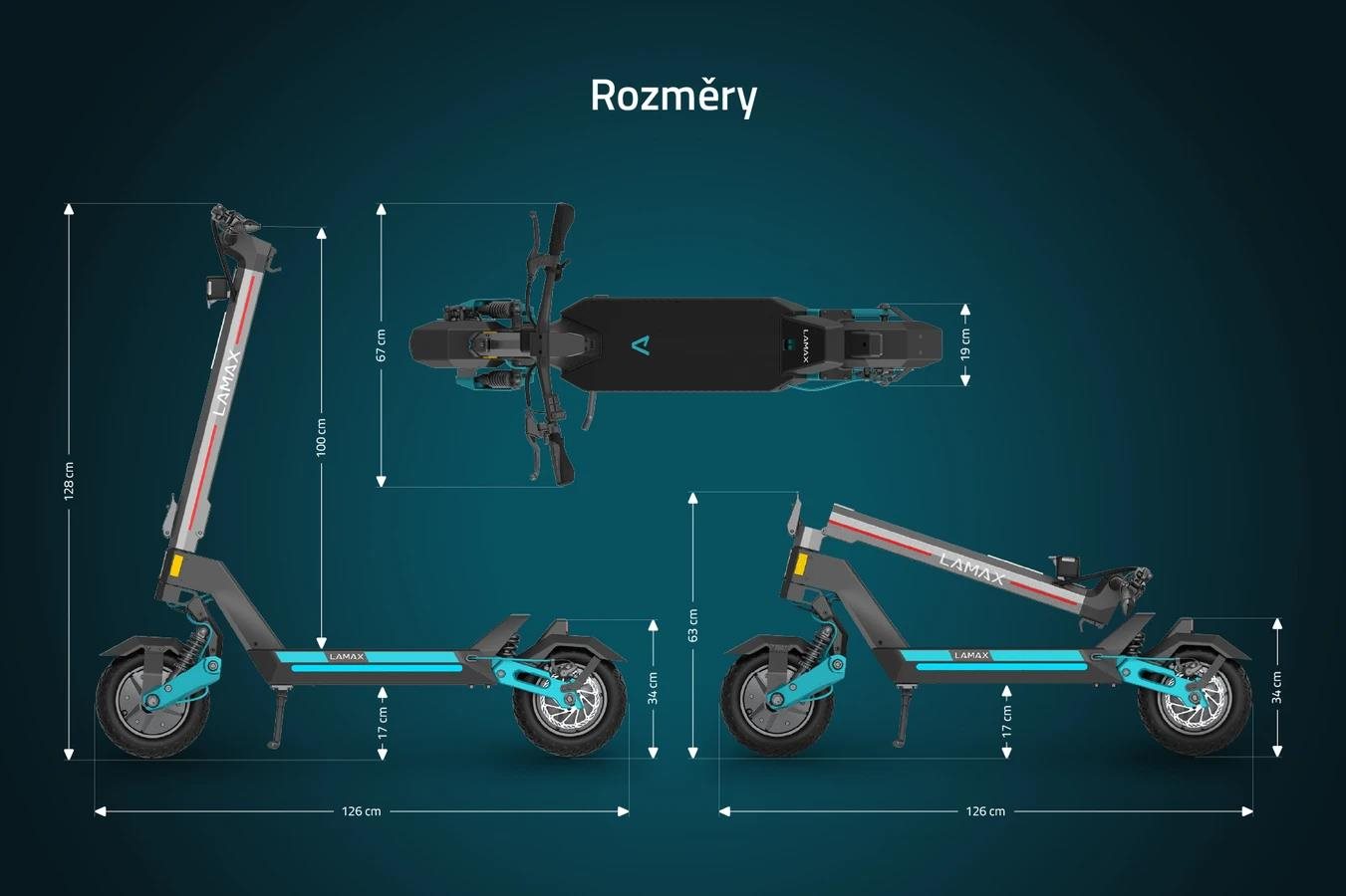 Rozměry (složená): 126 × 67 × 63 cm (délka, šířka, výška)