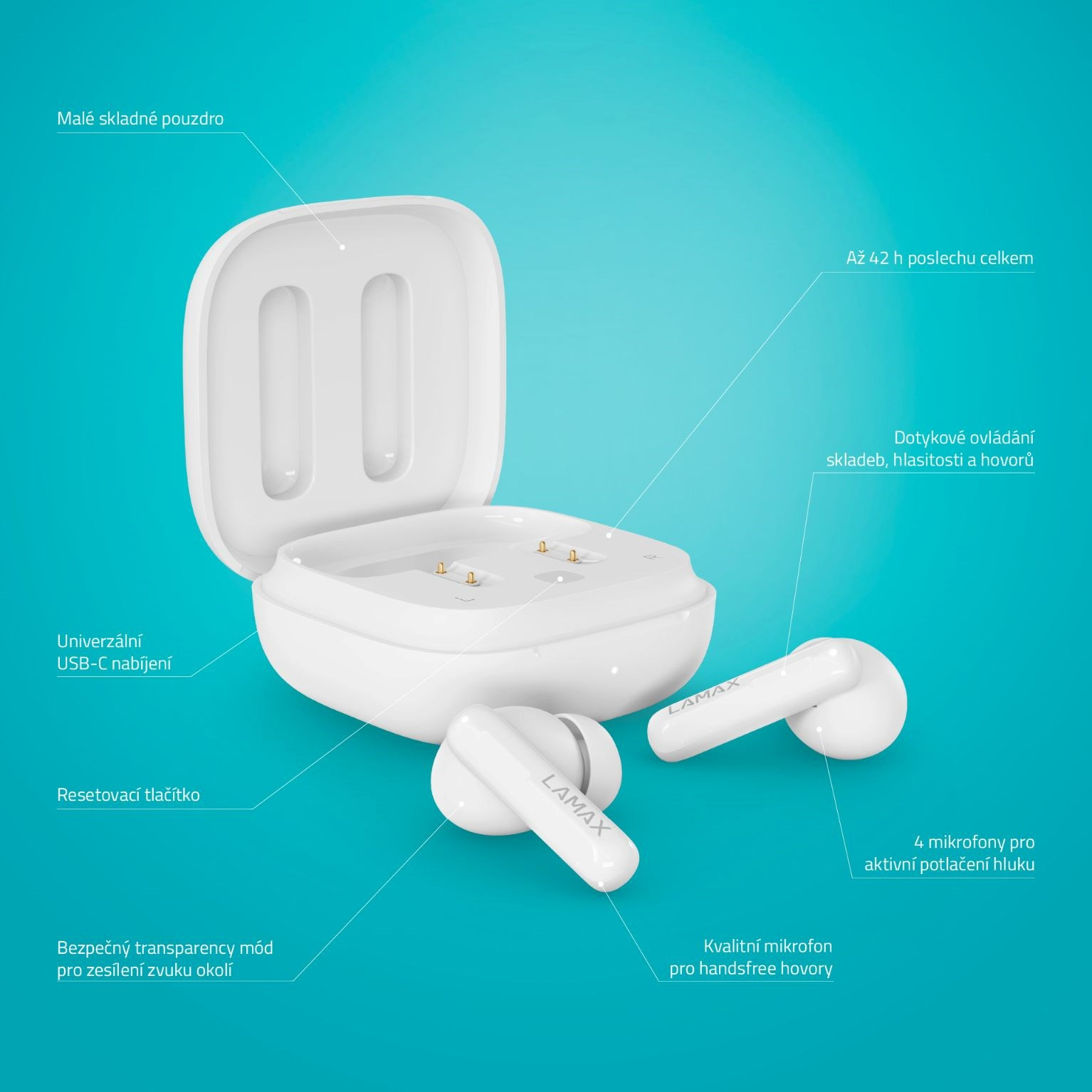 Pomalejším bráchou bezdrátovýho připojení Bluetooth 5.3 je blesk, takže si umíš představit, jak to mezi sluchátkama a telefonem lítá. Automaticky se spolu spárujou a už to frčí. Sluchátka zvládnou parádních 8 hodin na jedno nabití a dalších 34 hodin máš schovaných v pouzdru. Hovory přijímej bez obav, díky kvalitnímu mikrofonu tě vždycky bude slyšet čistě. Patříš mezi gamery nebo filmový maniaky, tak tvojí pozornosti nesmí uniknout herní mód s nízkou latencí. Všechny funkce ovládáš dotykově, takže no stress.