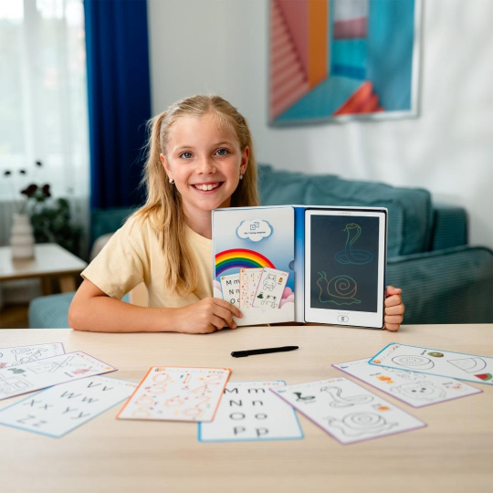 Velká plocha tabulky nabízí spoustu místa pro kreslení i zapisování nápadů, a přitom zůstává šetrná k dětským očím. Displej nebliká, nevyzařuje modré světlo a nenamáhá zrak ani při delším používání. Celý set, tabulka i šablony, je navíc uložený v praktickém obalu ve tvaru knížky, díky kterému zůstane všechno pěkně pohromadě a děti si tak mohou vzít zábavu kamkoliv s sebou.