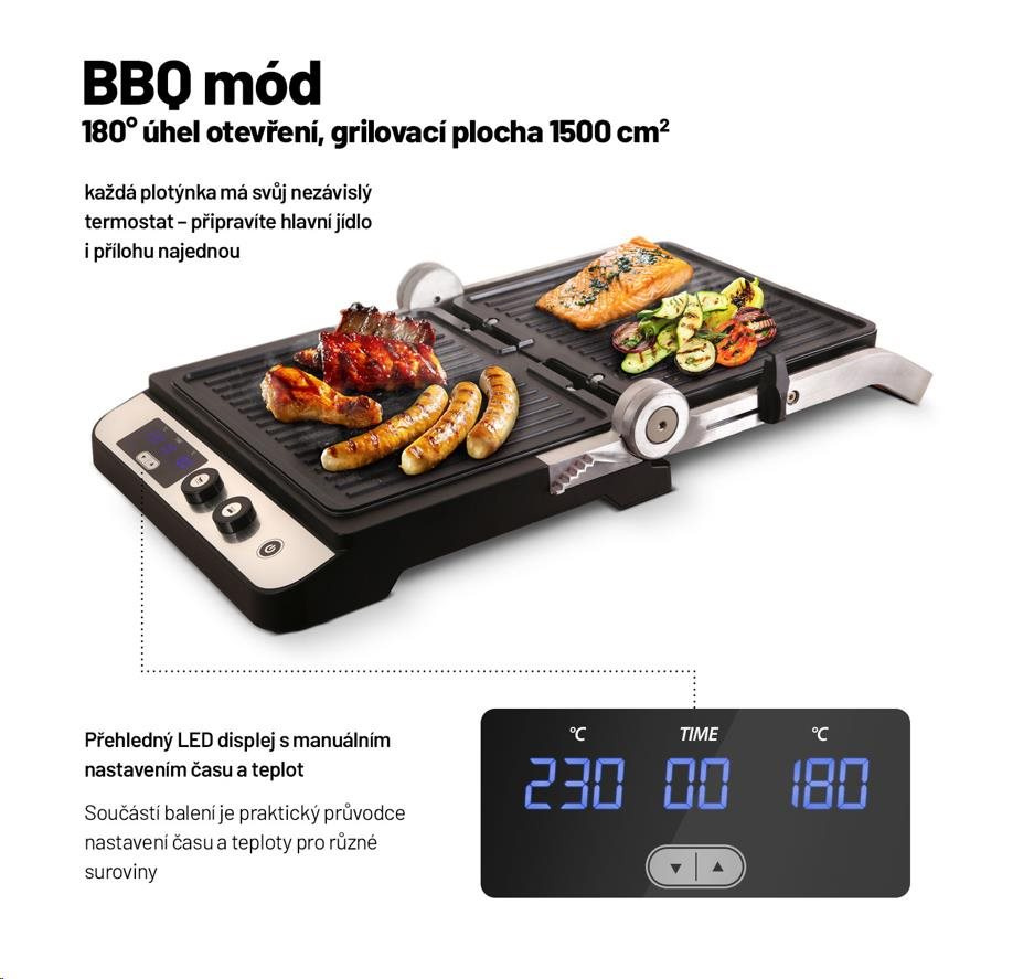Plotýnky grilu mají nastavitelnou polohu. Můžete například upravit výšku a sklon plotýnky tak, aby se snížil tlak působící na křehké suroviny, jako jsou třeba čerstvé ryby. V BBQ módu si u každé z plotýnek můžete nastavit požadovanou teplotu ohřevu separátně. Se správnou volbou teploty pro jednotlivé druhy potravin vám pomůže přiložený průvodce. Zároveň si pro každý pokrm můžete nastavit požadovaný čas přípravy, takže se nemusíte bát, že netrefíte správný stupeň propečení. Gril je vybaven i funkcí automatického vypnutí, díky vysokému výkonu se velmi rychle rozehřeje a o průběhu přípravy máte přehled díky LED displeji. V nabídce jsou i ploché plotýnky pro ještě širší možnosti grilu.