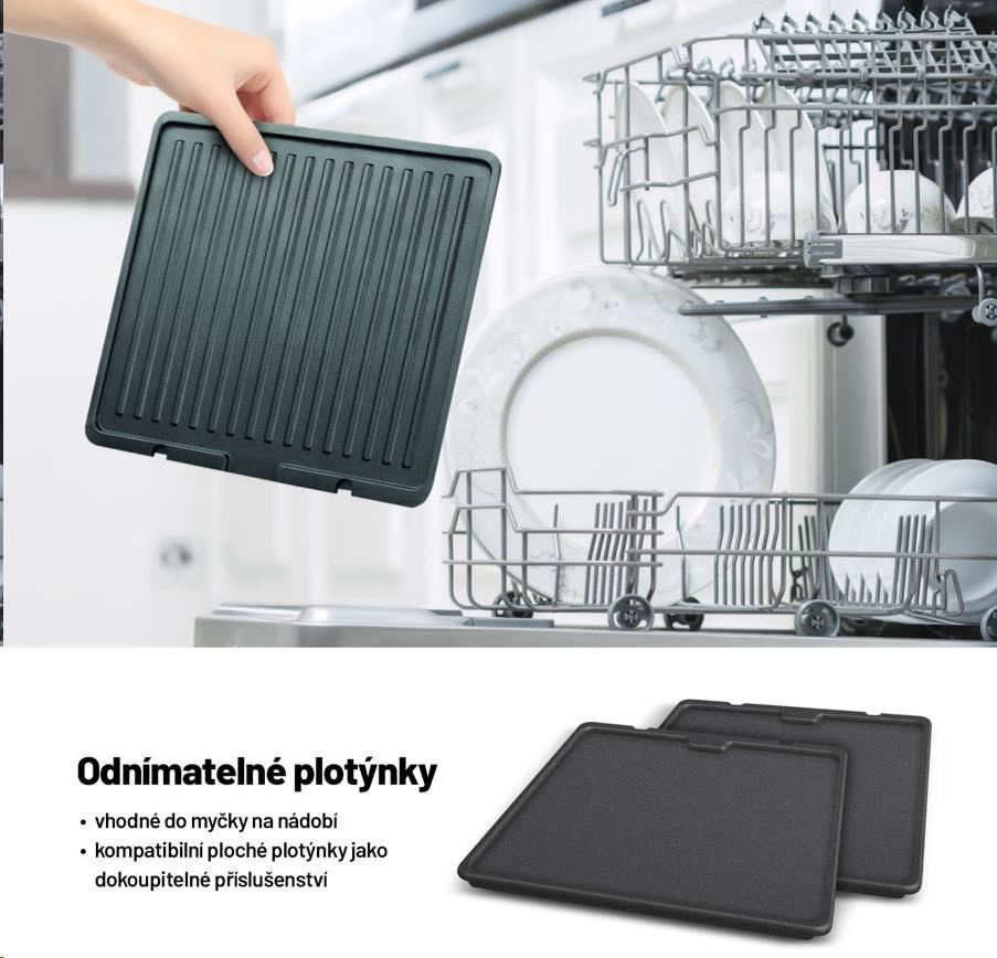 Obě grilovací plotýnky jsou odnímatelné a vhodné do myčky nádobí.