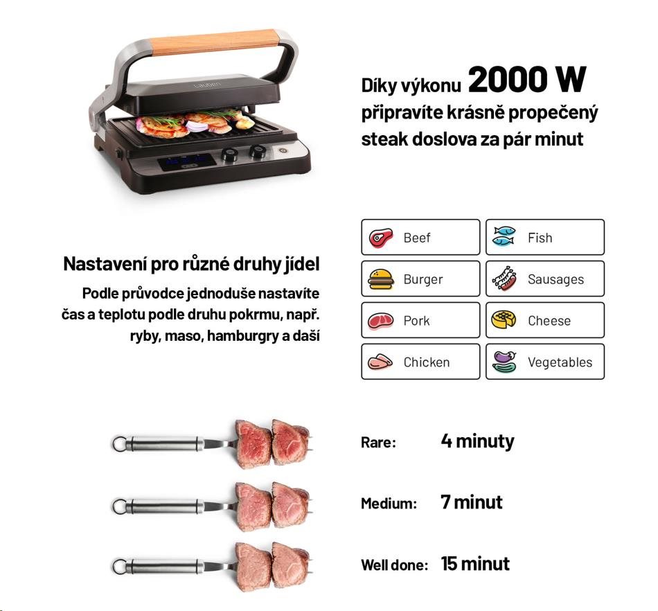 Lauben Contact Grill 2000SB – Stolní kontaktní gril s odnímatelnými plotýnkami a LED displejem