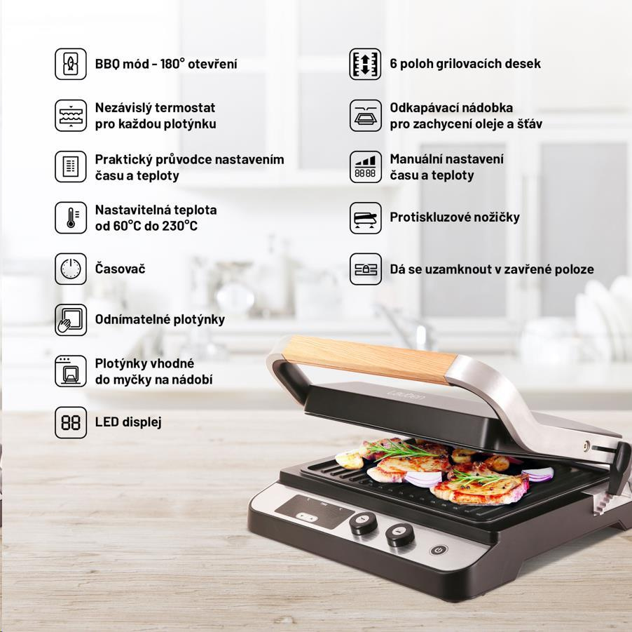 Ke slunným dnům letní sezóny neodmyslitelně patří venkovní grilování. S kontaktním grilem Lauben si ale můžete šťavnatý burger nebo čerstvou rybu vychutnat bez ohledu na počasí, kdykoli během roku. Tento flexibilní pomocník sjednocuje možnosti zapékacího kontaktního grilu a plnohodnotného stolního grilu. Je jen na vás, zda se rozhodnete připravit si rychlé domácí panini, nebo gril nastavíte do BBQ módu a uspořádáte večírek s grilováním pro přátele. Díky výkonu 2000 W si gril bez problému poradí i s prudkým opečením, které je potřeba u kvalitních steaků, disponuje dostatečnou grilovací plochou 1500 cm2, regulátorem teploty a časovačem. Plotýnky grilu jsou odnímatelné, každé z nich lze separátně nastavit teplota ohřevu a vy tak můžete připravovat různé druhy potravin zároveň. Teplota ohřevu lze nastavit v rozmezí od 60 do 230 °C, vhodnými teplotami pro jednotlivé druhy potravin vás provede přiložený průvodce. Součástí grilu je praktická miska na odkapávání přebytečného tuku a šťávy. Příjemným bonusem je kvalitní designové provedení vhodné do exteriéru i interiéru.