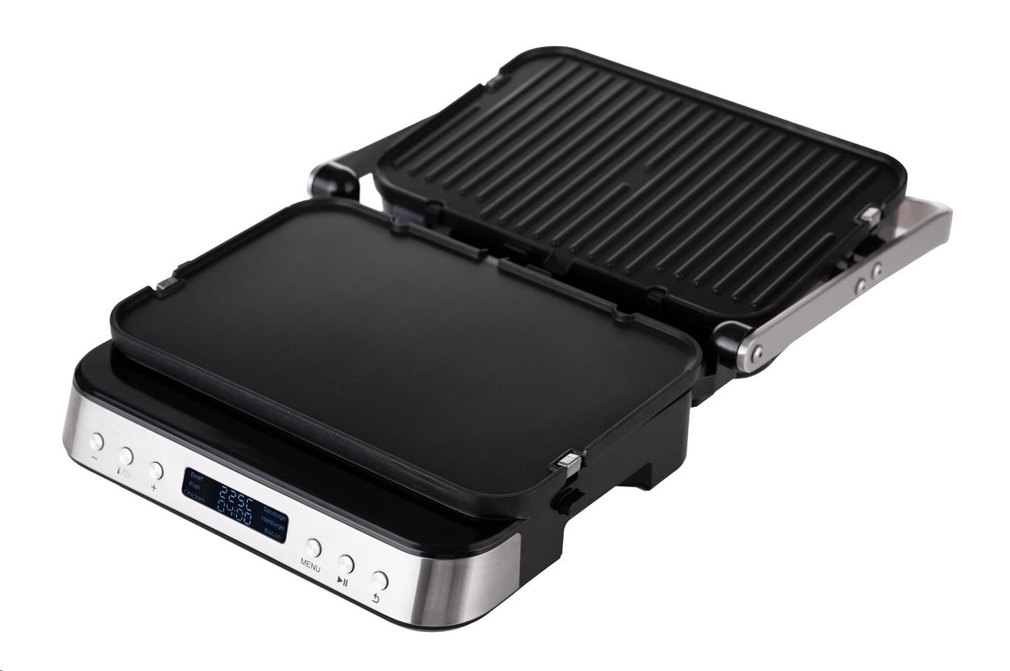 Kontaktní gril na zapékání, který po uvedení do vodorovné polohy přetvoříte na plnohodnotný stolní gril o ploše 1400 cm2.