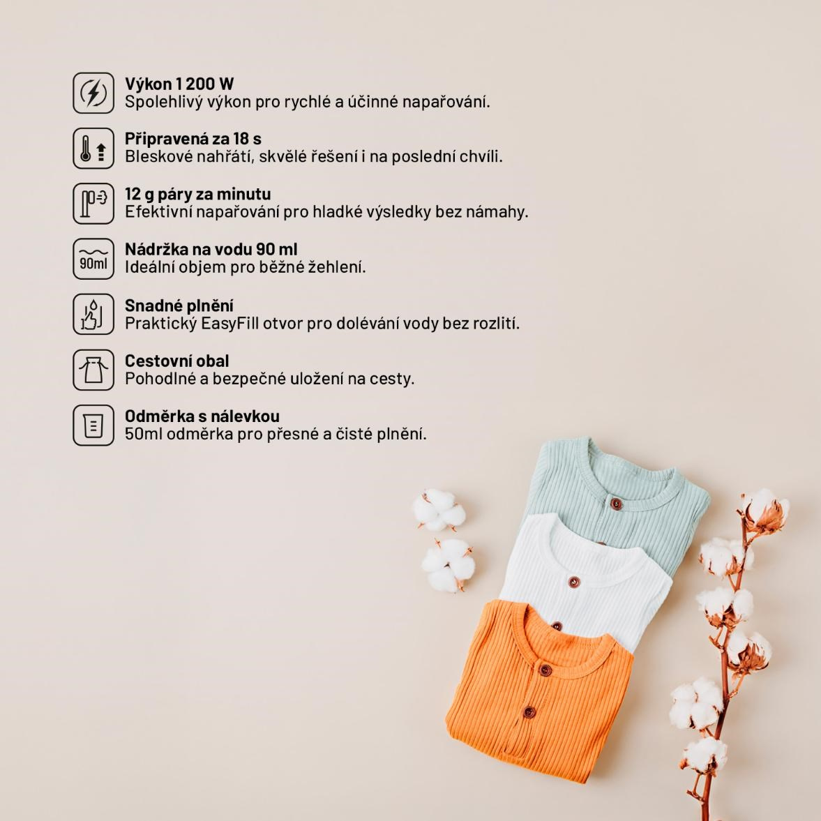 Silný výkon 1 200 W zajistí, že pára bude nekompromisní k záhybům, ale šetrná k vašemu oblečení. Přístroj je navržen tak, aby zvládl i hustší látky, aniž by je poškodil. Předehřátí trvá pouhých 18 vteřin, takže napařovačka je připravená prakticky okamžitě. Rychlý start oceníte hlavně ve spěchu, třeba před důležitým pracovním jednáním nebo večerní akcí. Parní výkon dosahuje až 12 gramů páry za minutu, což je dostatečné množství pro efektivní a rovnoměrné napařování. Pára proniká hluboko do tkaniny, takže oblečení nejen vyhladíte, ale i osvěžíte.