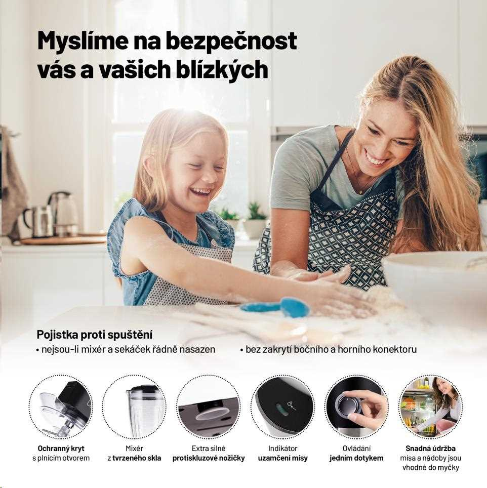 Bezpečnost by při vaření a přípravě potravin měla být vždy na prvním místě. Mysleli jsme na to i při vývoj tohoto kuchyňského robota. Díky pojistce se nikdy robot nespustí, není-li správně uzavřen. Disponuje i pojistkou proti přehřátí a extra silnými protiskluzovými nožkami, které se starají o to, aby robot zůstal na svém místě.