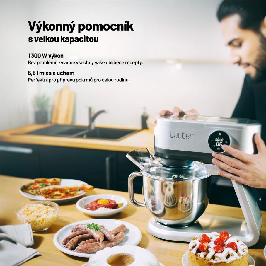 Kuchyňský robot Lauben Kitchen Machine 1300SG vyniká nejen praktičností, ale také vzhledem. Jeho prémiový design se stane ozdobou každé kuchyně. Netřeba se obávat, že by putoval po kuchyňské lince, kam se mu zachce. Protiskluzové nožičky ho drží na místě, i když zpracovává velmi tuhé těsto, a plynulý přechod rychlostí se postará, aby změna rychlosti nezpůsobila rozklepání. Vše potřebné k ovládání se dozvíte z video tutoriálu a pro inspiraci do začátku společného vaření a pečení máte přibalenu kuchařku.