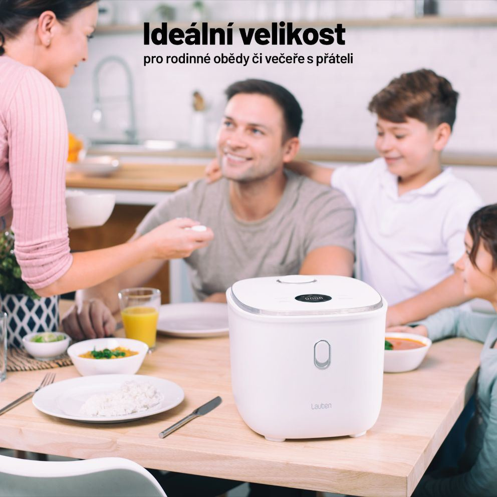 Designově vyladěný Lauben Low Sugar Rice Cooker 3000WT představuje ideální řešení pro velkou rodinu. Jídla připravíte s minimem tuku a nepřipálí se. Jeho 3l nádoba s prémiovým nepřilnavým keramickým povrchem se snadno udržuje, stačí ji vložit do myčky. Ovládání rýžovaru je velmi jednoduché prostřednictvím digitálního dotykového displeje. Pro zajištění bezpečnosti je přístroj vybaven ochranou proti přetečení díky mikrotlaku a technologií Cool Touch zajišťující, že se o vnější plášť nikdo nepopálí.