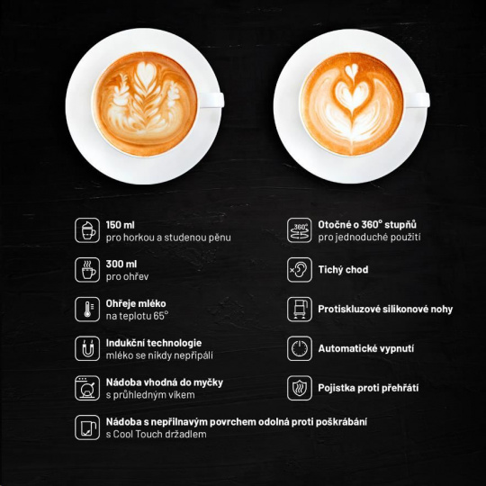 Váš domácí baristaLauben Milk Frother 550BC je nezbytným pomocníkem pro všechny milovníky kávy s bohatou a krémovou pěnou. S tímto pěničem mléka vytvoříte dokonalou pěnu a ušetříte za návštěvu kavárny pokaždé, když vás přepadne chuť na nadýchané latté nebo cappuccino. Pěnič pracuje ve 3 různých režimech a vy si tak můžete vybrat mezi horkou pěnou z plnotučného mléka do lahodného cappuccina, studenou do letních mléčných koktejlů, nebo ohřevem mléka do kakaa pro vaše nejmenší. Pěnič mléka tvoří základna a ohřívací nádoba. Základna je opatřena protiskluzovými nožičkami a 360° systémem, díky kterému do ní můžete ohřívací nádobu umístit v jakémkoli směru. Ohřívací nádoba má nepřilnavý povrch, který zabraňuje přichycení nebo odření. Díky indukční technologii ohřevu se mléko nikdy nepřipálí. Pěnič navíc disponuje i ochranou proti přehřátí, takže máte jistotu, že mléko nebo pěna bude mít vždy správnou teplotu mezi 60 - 75 °C. Starosti vám nebude dělat ani údržba, ohřívací nádobu totiž můžete bez problému mýt v myčce nádobí. Třešničkou na dortu je prémiový design značky Lauben, který se hodí do každé kuchyně.