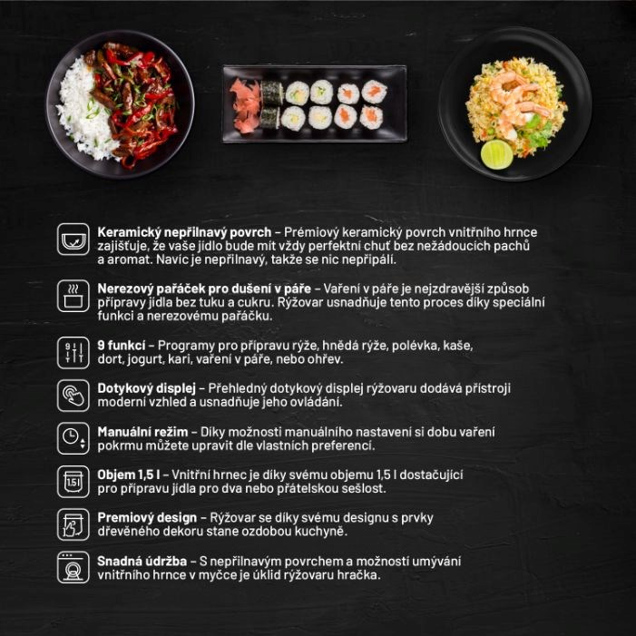 Dopřejte si více času na jiné aktivity a vaření přenechte multifunkčnímu rýžovaru, jehož 9 přednastavených programů si poradí s přípravou nejrůznějších pokrmů. Programy jako rýže, hnědá rýže, polévka, kaše, dort, jogurt, kari, vaření v páře, či ohřev jsou zárukou snadného a rychlého vaření. Prémiový keramický povrch vnitřního hrnce navíc neuvolňuje žádnou nežádoucí pachuť ani aroma, příprava pokrmů je tak zdravější. Pokud chcete svůj životní styl ještě vylepšit, využijte nerezového pařáčku pro dušení v páře. Pařáček je navhrnutý tak, že šťávy z připravovaného jídla nekapou do rýže připravované pod ním.