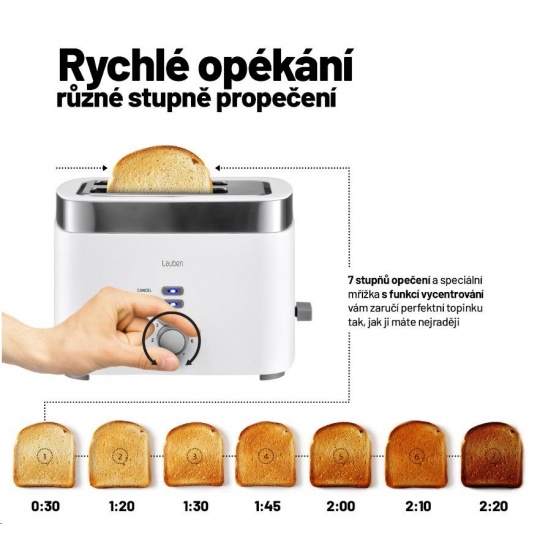 Každý druh pečiva potřebuje jiné nastavení, stejně tak každý máme jiné chutě. S Lauben Toaster si můžete vybrat ze 7 stupňů opečení pečiva, na své si tak přijdou milovníci pečiva opečeného dohněda i ti, kteří raději lehce zlatavou křupavou variantu.