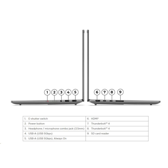 | Standartné porty | 1x USB-A (USB 5Gbps / USB 3.2 Gen 1) 1x USB-A (USB 5Gbps / USB 3.2 Gen 1), Always On 2x USB-C® (Thunderbolt™ 4 / USB4® 40Gbps), with USB PD 3.0 and DisplayPort™ 2.1 1x HDMI® 2.1, up to 8K/60Hz 1x Headphone / microphone combo jack (3.5mm) 1x SD card reader |