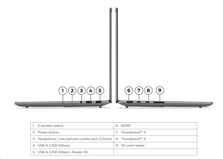 | Standartné porty | 1x USB-A (USB 5Gbps / USB 3.2 Gen 1) 1x USB-A (USB 5Gbps / USB 3.2 Gen 1), Always On 2x USB-C® (Thunderbolt™ 4 / USB4® 40Gbps), with USB PD 3.0 and DisplayPort™ 2.1 1x HDMI® 2.1, up to 8K/60Hz 1x Headphone / microphone combo jack (3.5mm) 1x SD card reader |