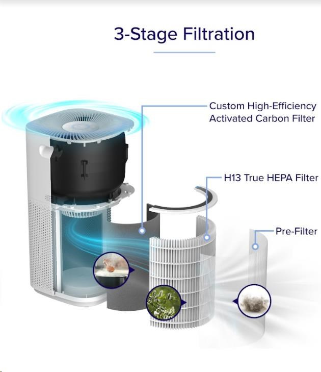 Druhou vrstvou je HEPA filtr H13. To odlišuje Levoit od konkurence, protože filtr HEPA H13 je mnohem kvalitnější a spolehlivější než běžně používané HEPA H11. Zde se odfiltrují jemné prachové částice, plíseň, bakterie, pyl, kouřové částice, roztoče a srst.