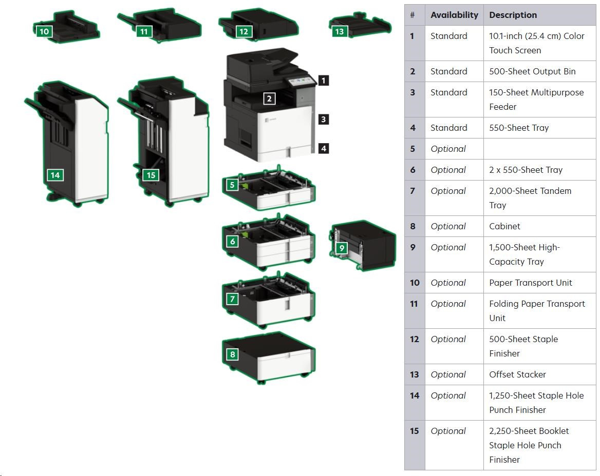 .Part Number 20L8300 Print Technology Color Laser Function Color Copying Color Faxing Color Printing Color Scanning Trusted Platform Module (TPM) The Trusted Platform Module (TPM) is not available in some countries. Workgroup Size Large Workgroup Touch Screen Display Yes Display Lexmark e-Task 10-inch (25 cm) class color touch screen Print Speed (Letter, Black) Up to 55 ppm4 Print Speed (Letter, Color) Up to 55 ppm4 Print Speed (Letter, Black) Duplex Up to 55 spm4 Print Speed (Letter, Color) Duplex Up to 55 spm4 Time to First Page (Black) As fast as 7.1 seconds Time to First Page (Color) As fast as 8.2 seconds Duplex (2-sided) Printing Integrated Duplex Print Resolution, Black 1200 x 1200 dpi 4800 Color Quality Print Resolution, Color 1200 x 1200 dpi 4800 Color Quality Copy Speed (Letter, Black) Up to 55 cpm4 Copy Speed (Letter, Color) Up to 55 cpm4 Copy Speed (Letter, Black) Duplex Up to 55 spm4 Copy Speed (Letter, Color) Duplex Up to 55 spm4 Time to First Copy (Black) As fast as 8.5 seconds Time to First Copy (Color) As fast as 9.5 seconds Reduce / Enlarge Range 25 - 400 % A4/Ltr Simplex Scan Speed (Black) Up to 120/120 sides per minute A4/Ltr Simplex Scan Speed (Color) Up to 120/120 sides per minute A4/Ltr Duplex Scan Speed (Black) Up to 240/240 sides per minute A4/Ltr Duplex Scan Speed (Color) Up to 240/240 sides per minute Scan Area, Maximum 11.69 x 17.0 inches ADF Scan DADF (single pass Duplex) Scanner Type Flatbed scanner with automatic document feeder Scan Resolution, Enhanced 600 x 600 dpi Scan Resolution, Optical 300 x 300 dpi Optical Scanning Resolution 300 X 300 dpi Scan File Formats (Send as) JPEG, JPG PDF Secure PDF TIFF Archival PDF (A-1a, A-1b) Searchable PDF TXT RTF DOCX Scan Destinations e-mail FTP USB Flash drive USB or Network connected computer Processor Speed Quad Core, 1.2 GHz Memory, Standard 4 GB Memory, Maximum 4 GB Hard Disk Intelligent Storage Drive included; Magnetic Hard Disk available Apple Operating Systems Supported Support is provided through AirPrint and AirScan only Citrix MetaFrame Microsoft Windows Server 2012 R2 Datacenter Edition running Citrix XenApp 7.5, 6, 7, 8, 9, 11, 12, 13, 14, 15, 16 Microsoft Windows Server 2012 Datacenter Edition running Citrix XenApp 7.5, 6, 7, 8, 9, 11, 12, 13, 14, 15, 16 Microsoft Windows Server 2012 Foundation running Citrix XenApp 6.0, 6.5 Microsoft Windows Server 2012 Essentials running Citrix XenApp 6.0, 6.5 Microsoft Windows Server 2012 Standard running Citrix XenApp 6.0, 6.5 Linux Operating Systems Supported Ubuntu 20.04 Debian 10 SUSE Linux Enterprise Server 12 SP5 OpenSUSE 15.2 Debian 11 Ubuntu 22.04 Fedora 36 Fedora 37 SUSE Linux Enterprise Server 15 SP4 OpenSUSE 15.4 Red Hat Linux 8.7 Red Hat Linux 9.1 Microsoft Windows Operating Systems Supported Windows Vista Windows Vista x64 Windows Server 2008 Windows Server 2008 x64 Windows Server 2008 running Terminal Services Windows Server 2008 x64 running Terminal Services Windows 7 Windows 7 x64 Windows Server 2008 R2 Windows Server 2008 R2 running Terminal Services Windows 8 Windows 8 x64 Windows Server 2012 Windows 8.1 Windows Server 2012 R2 Windows 10 Windows Server 2016 Windows Server 2019 Windows Server 2022 Windows 11 Novell Operating Systems Supported Novell NetWare 6.5 Open Enterprise Server Novell Open Enterprise Server 2 (SP3) on SuSE Linux Enterprise Server 10 SP4 (x86 and x64) 3 Novell Open Enterprise Server 11 (SP3) on SuSE Linux Enterprise Server 11 SP4 (x86 and x64) Novell Open Enterprise Server 11 (SP3) on SuSE Linux Enterprise Server 12 SP1 (x86 and x64) Novell Open Enterprise Server 15 (SP1) on SuSE Linux Enterprise Server 11 SP4 (x86 and x64) Other Operating Systems Supported Virtually any platform supporting TCP/IP Included Paper Handling 550-Sheet Tray 150-Sheet Multipurpose Feeder 500-Sheet Output Bin Optional Paper Handling 550-Sheet Tray Offset Stacker 500-Sheet Staple Offset Finisher 2 x 550-Sheet Tray 2000-Sheet Tandem Tray Cabinet 1,500-Sheet High-Capacity Tray Paper Transport Unit Folding Paper Transport Unit 1,250-Sheet Staple Hole Punch Finisher 2,250-Sheet Booklet Staple Hole Punch Finisher Paper Input Capacity, Standard Up to 700 pages 20 lb or 75 gsm bond Paper Input Capacity, Maximum Up to 4750 pages 20 lb or 75 gsm bond Paper Output Capacity, Standard Up to 500 pages 20 lb or 75 gsm bond Paper Output Capacity, Maximum Up to 2650 pages 20 lb or 75 gsm bond Paper Weight Range Supported - Standard Tray (lb.) 16 - 80 lb. Paper Weight Range Supported - Multipurpose Feeder (lb.) 16 - 80 lb. A3 / 11 x 17 Yes ADF 300-Sheet Automatic Document Feeder ADF Paper Input Capacity Up to 300 pages 20 lb or 75 gsm bond ADF Paper Output Capacity Up to 300 pages 20 lb or 75 gsm bond Finishing Option Yes Finishing Functions Offset stacking Stapling Hole punching Number of Paper Inputs, Standard 2 Number of Paper Inputs, Maximum 6 Media Types Supported Card Stock Envelopes Glossy Paper Labels Plain Paper Vinyl Labels Refer to the Paper & Specialty Media Guide Media Sizes Supported 10 Envelope 7 3/4 Envelope 9 Envelope A3 A4 A5 B5 Envelope C4 Envelope C5 Envelope DL Envelope Hagaki Card Executive Folio JIS-B4 JIS-B5 Ledger Legal Letter Statement Oficio A6 SRA3 Standard Ports USB 2.0 Specification Hi-Speed Certified (Type B) Gigabit Ethernet (10/100/1000) Front USB 2.0 Specification Hi-Speed Certified port (Type A) 802.11a/b/g/n/ac + Apple iBeacon Optional Local Ports Internal RS-232C serial Internal 1284-B Bidirectional Parallel Optional Network Ports MarkNet N8230 Fiber Ethernet Print Server Direct USB Yes Ethernet Network Yes Wireless Yes Wireless Network WPA2™ - Personal WPA™ and WPA2™ - Personal 802.1x Authentication: MD5, MSCHAPv2, LEAP, PEAP, TLS, TTLS Network Protocol Support TCP UDP IPSEC w/ IPv4 IPSEC w/ IPv6 ICMP IGMP IPv4 IPv6 Network Printing Methods Direct IP (Port 9100) Enhanced IP (Port 9400) FTP IPP 1.0, 1.1, 2.0 (Internet Printing Protocol) Microsoft Web Services WSD Pull Printing Thin Print LPR Network Management Protocols WINS AP
