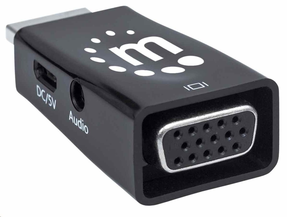 The Manhattan HDMI to VGA Micro Converter establishes a fast, simple and convenient link between a newer HDMI-equipped desktop, notebook computer or other media source and an existing VGA monitor, projector or other display device. The Manhattan HDMI to VGA Micro Converter is easy and quick to install and requires no complicated configuration or setup. This converter helps extend the service life of legacy VGA display equipment so you can get the most out of your investment and fully realize its value. The Manhattan HDMI to VGA Micro Converter offers a low-power, cost-effective and reliable solution so users can transition to HDMI bandwidths, resolutions, Deep Color and more without the expense of upgrading to newer and costly monitors and projectors. Its integrated, all-in-one design helps achieve a compact, integrated solution that eliminates unnecessary cables, tangles and clutter to keep installations and workspaces neat and orderly. Its 3.5 mm stereo port allows the converter to transmit audio to an external audio device, and its Micro-USB port allows for additional power if required.