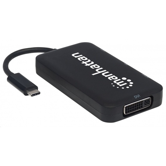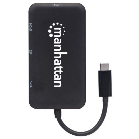 The Manhattan USB-C 4-in-1 Audio/Video Converter establishes a fast, simple and convenient link between newer USB Type-C equipped media sources (computers, tablets, Smartphones, etc.) and existing HDMI, DisplayPort, VGA or DVI displays (monitors, projectors, etc.). The Manhattan USB-C 4-in-1 Audio/Video Converter is easy and quick to install — no complicated configuration or setup required. Its all-in-one design achieves a compact, integrated solution that eliminates unnecessary cables, tangles and clutter to keep installations and workspaces neat and orderly. Extend the service life of your equipment, and fully realize the investment and value of your HDMI, DP, VGA or DVI displays, projectors and peripherals with a Manhattan USB-C 4-in-1 Audio/Video Converter.