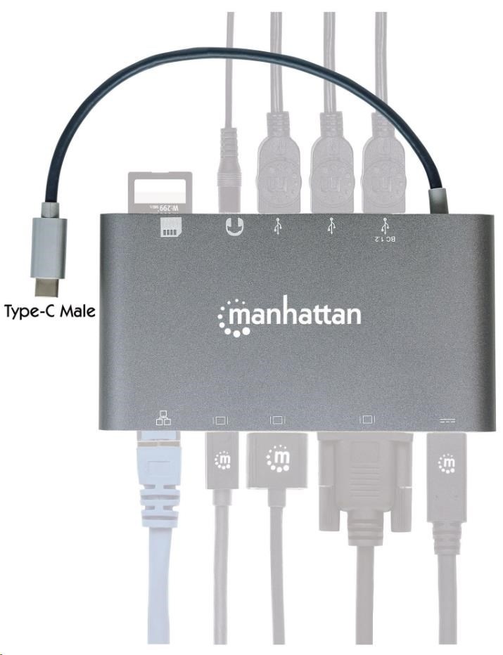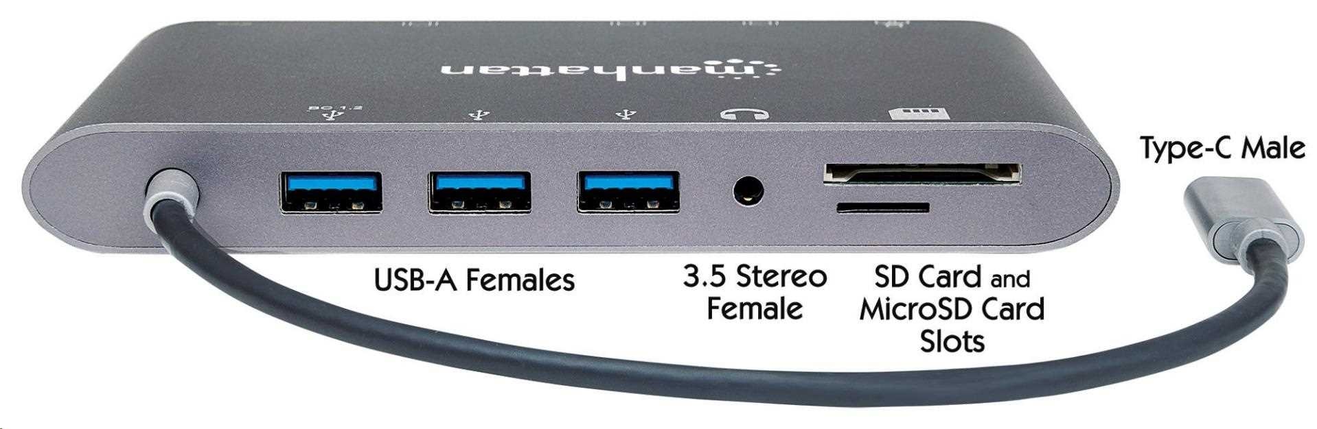 The Manhattan SuperSpeed USB-C to 7-in-1 Docking Station establishes a fast, simple and convenient link between newer USB Type-C-equipped media sources (computers, tablets, Smartphones, etc.) and an existing HDMI/Mini DP/VGA display (monitors, projectors, etc.), in either mirror- or extended-display mode. Create a mini-workstation by adding any USB 3.0 (and earlier) peripheral, such as a mouse, keyboard, hub, external memory device and more, with the integrated USB-A ports, Gigabit network connection, 3.5 mm Stereo and SD and Micro SD card slot, all while charging your device through the USB-C port.
