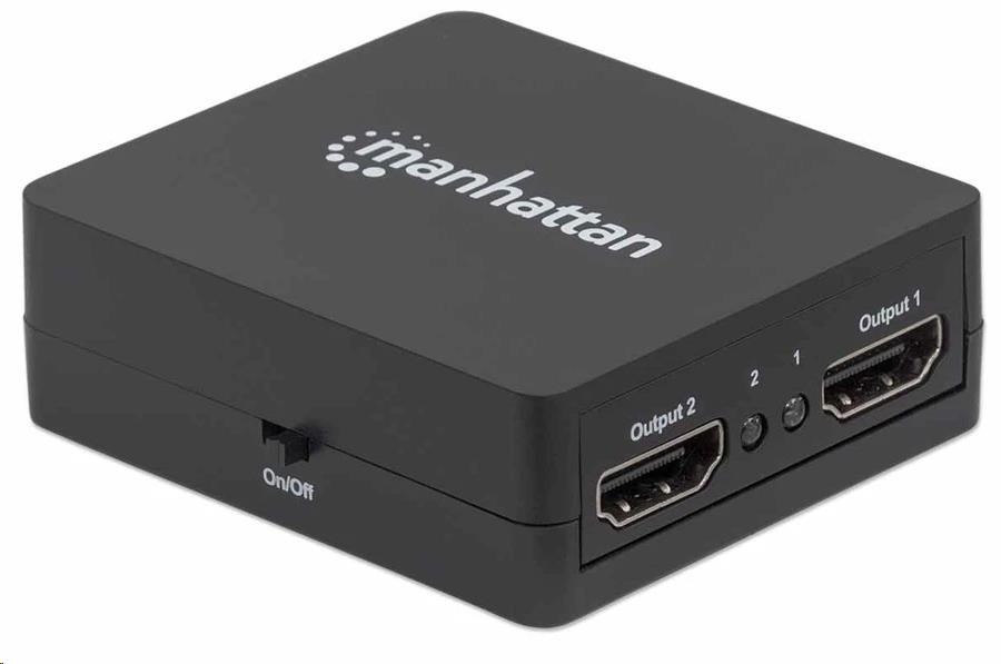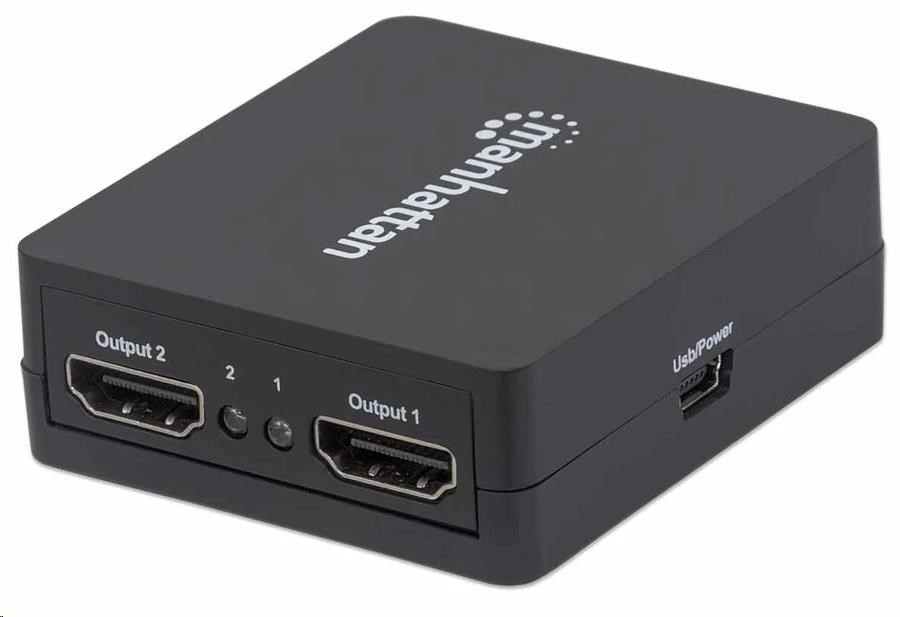 Easily distribute a single HDMI signal to multiple displays.The Manhattan 1080p 2-Port HDMI Splitter sends HDMI signals from a single Blu-ray player, satellite receiver, digital recorder, set-top box, game console or other HDMI source to two HDMI displays. Flexible Solution for Many A/V ApplicationsIdeal for trade shows, classrooms, video conferencing, presentations and retail applications, the Manhattan 1080p 2-Port HDMI Splitter features a built-in booster for added signal strength. It’s also a good choice for splitting and distributing a synchronous signal to multiple HDMI displays when source equipment is remotely stored in a secured room or cabinet. Users can cascade multiple units up to three levels and output HDMI video/audio to additional displays in widely distributed applications.Quality Construction and Easy InstallationFull compliance with HDMI, HDCP 1.0, 1.1 and 1.2 as well as DVI 1.0 ensures that the Manhattan 1080p 2-Port HDMI Splitter can provide long service and reliable performance. Quickly connect HDMI cables (not included) and the USB power cable, and this affordable HDMI solution is complete — no complicated settings or software or hardware configurations necessary.