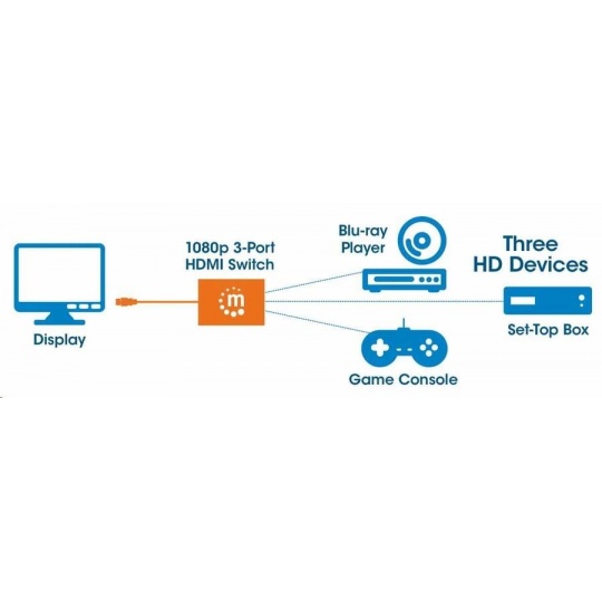 The Manhattan 1080p 3-Port HDMI Switch allows media enthusiasts to connect three HDMI video sources — including gaming consoles, Blu-ray players, satellite receivers, digital recorders, set-top boxes and other devices — to a single high-definition display.