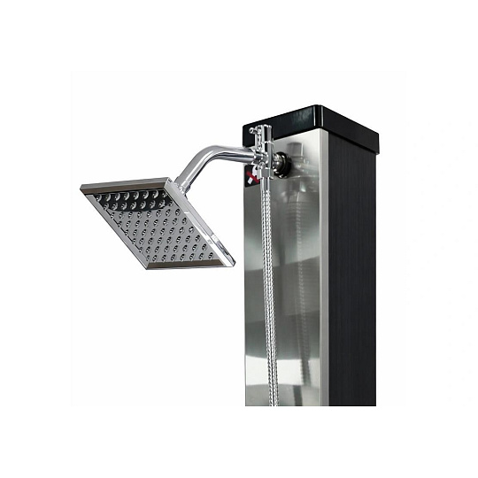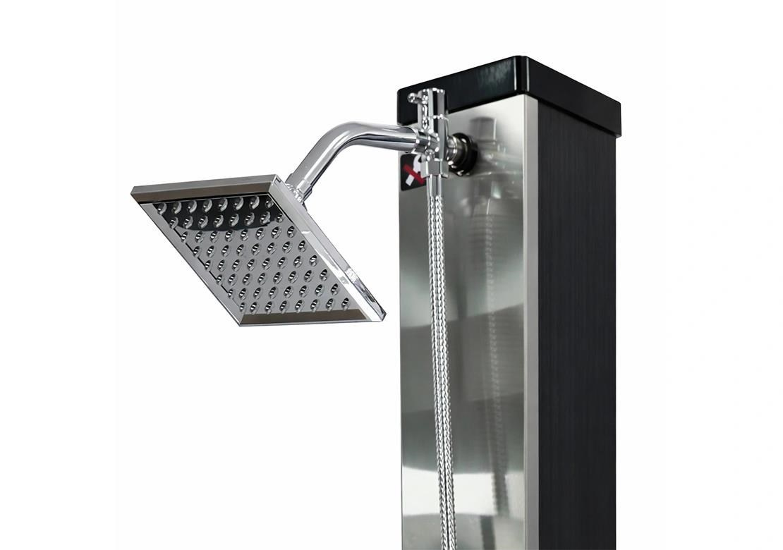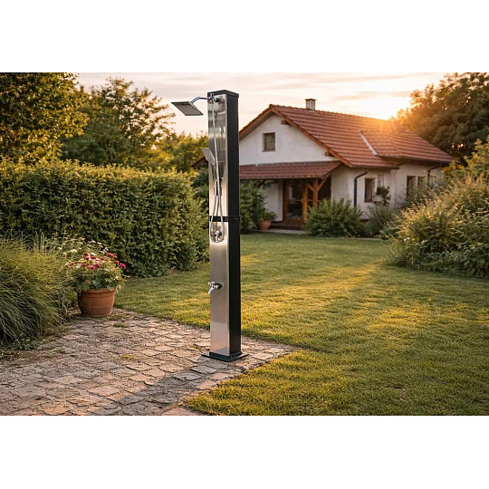 Zahradní dvoudílná a skladná sprcha DUO s objemem 40 l pro venkovní použití zajistí ohřev vody přiváděné ze zahradní hadice a tím perfektní pocit pohodlí při sprchování teplou nebo vlažnou vodou. Sprcha má pákovou baterii, ruční sprchu i kohoutek na oplach nohou. Ohřev vody zajišťuje sluneční záření a tělo sprchy, které funguje jako solární kolektor. Pro sprchování musí být zahradní sprcha stále napojena na vodovodní řad. Není-li napojena, nelze se sprchovat. Sprcha se kotví pomocí 4 šroubů (nejsou součástí balení) pevně k zemi, čímž je zajištěna její perfektní stabilita.