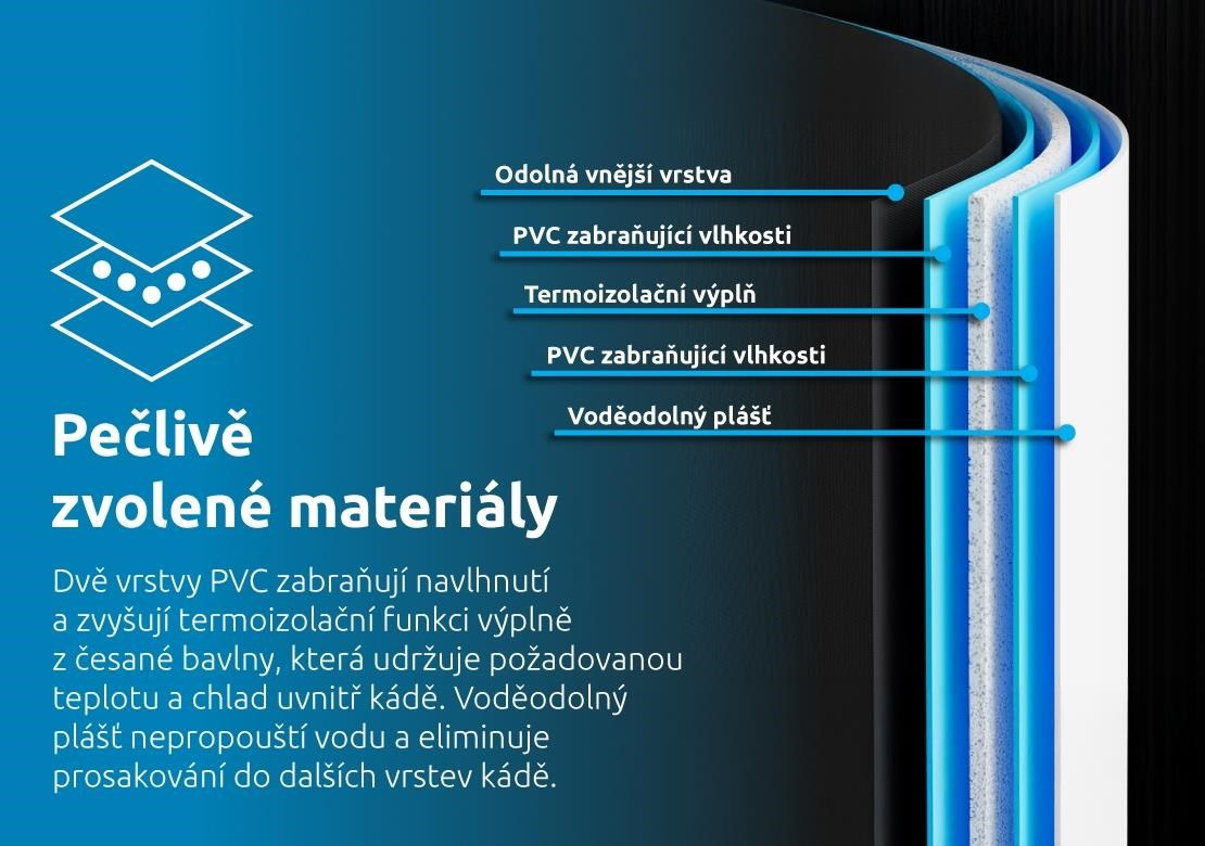 Dvě vrstvy PVC a výplň z česané bavlny zajišťují perfektní termoizolaci a zabraňují navlhnutí. Voděodolný plášť navíc eliminuje prosakování a udržuje obsah kádě v perfektním stavu.