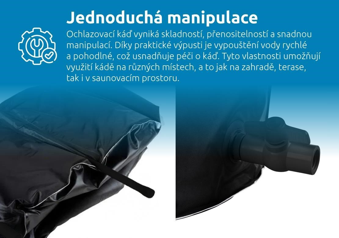 Díky odolnosti vůči teplotám v rozmezí -20 °C až 50 °C můžete káď využívat po celý rok, a to bez ohledu na počasí. Praktická výpusť umožňuje rychlé vypuštění vody, zatímco vnější kryt chrání káď před nečistotami, prachem a hmyzem. Termokryt navíc udržuje optimální teplotu vody, minimalizuje tepelné ztráty a zvyšuje energetickou úspornost. Tyto vlastnosti společně s jednoduchou manipulací dělají z ochlazovací kádě ideálního společníka na zahradu, terasu i do saunovacího prostoru.