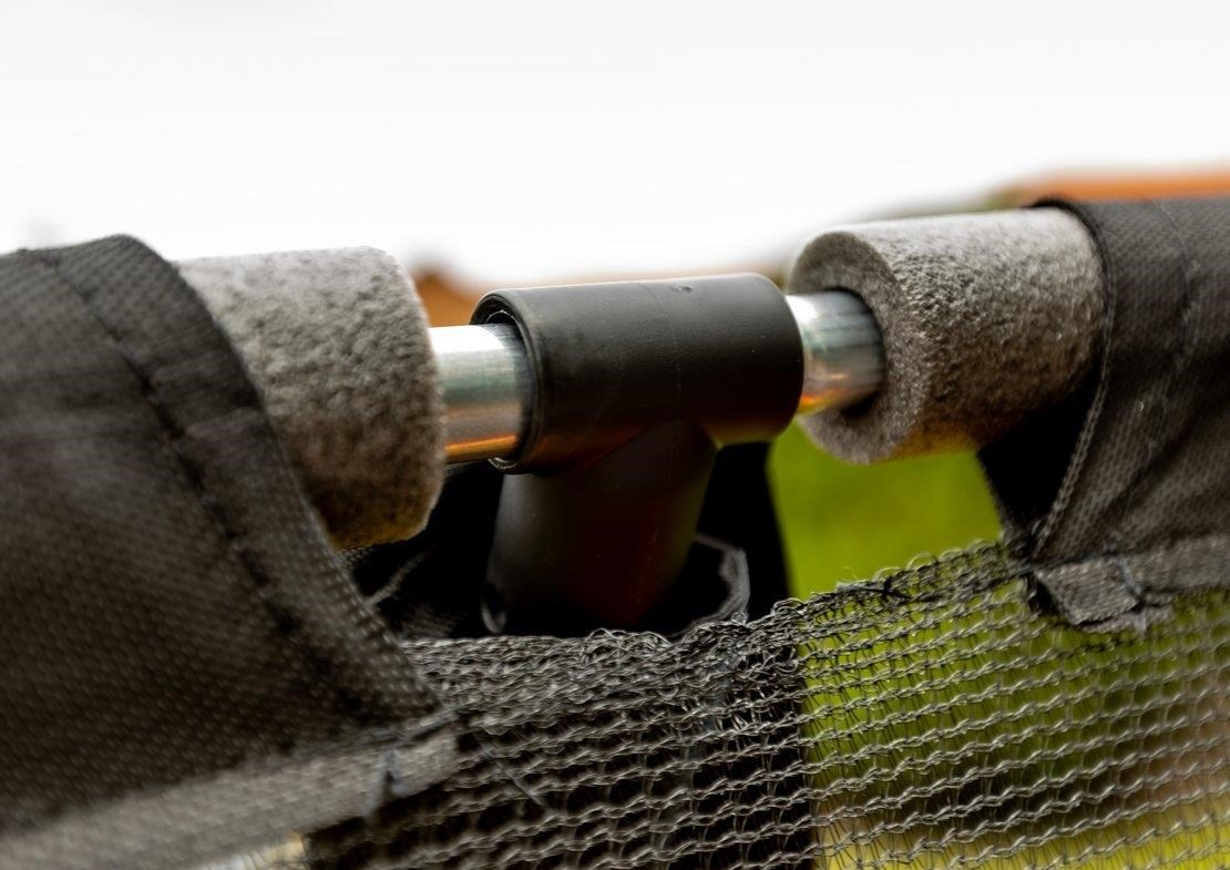- Horní obruč trampolíny spojena se stojnami pomocí T-spojů; T-spoje přispívají ke stabilitě trampolíny a snazší montáži
