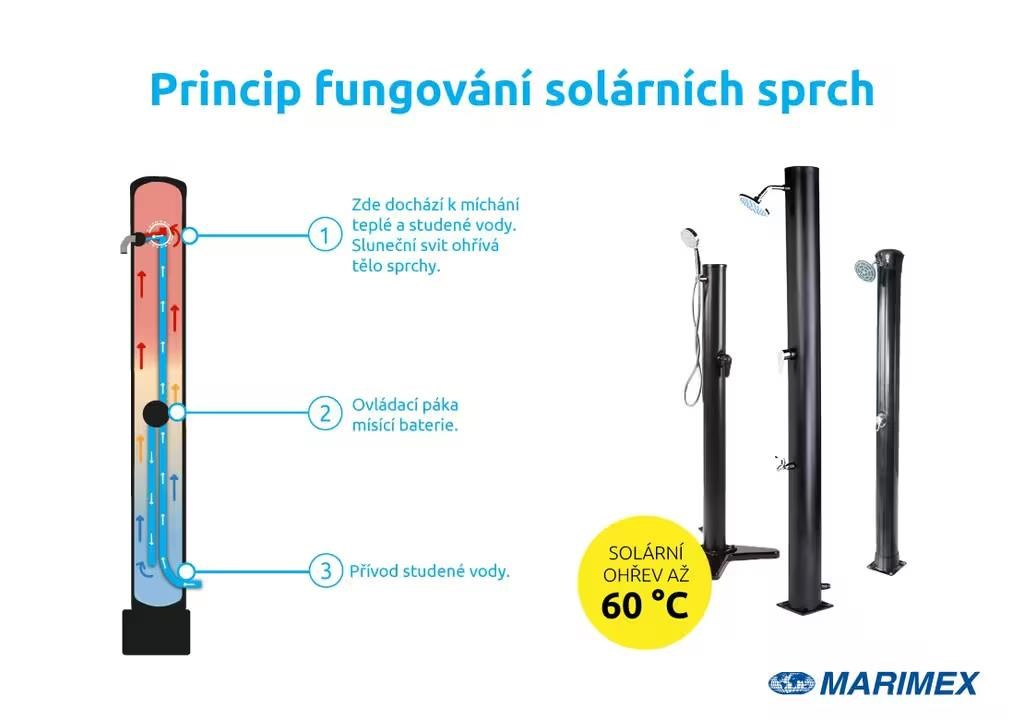 Zajistí ohřev vody přiváděné ze zahradní hadice a tím perfektní pocit pohodlí při sprchování teplou nebo vlažnou vodou. Ohřev vody zajišťuje sluneční záření a tělo sprchy, které funguje jako solární kolektor.