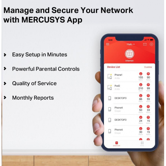 • Snadné ovládání pomocí aplikace – s aplikací MERCUSYS můžete rychle nastavit a spravovat Wi-Fi.