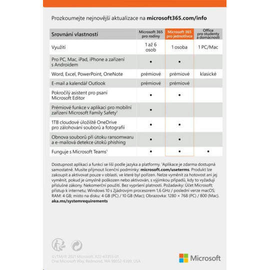 Předplatné Microsoft 365 (dříve známé jako Office 365) umožňuje ovládání nejen klasicky klávesnicí a myší, ale i prostřednictvím dotyku a stylusů, abyste byli na každém zařízení maximálně efektivní. Tato licence pro jednotlivce Microsoft 365 zahrnuje aplikace Word, Excel, PowerPoint, OneNote a další pro 1 osobu na rok (možnost nainstalovat až na 5 zařízení, ovšem vždy jedné osoby). K předplatnému dostanete také 1TB online úložiště OneDrive, abyste měli vaše důležité dokumenty zálohované a k dispozici, kdykoli a kdekoli potřebujete – na každém zařízení!