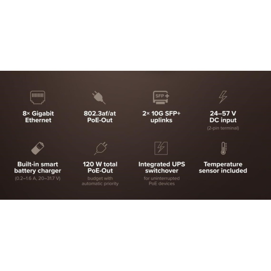 Kompaktní PoE switch s integrovanou UPS a inteligentní nabíječkou baterií – garance bezvýpadkového provozu CCTV kamer a přístupových bodů při výpadích napájení. Výpadky proudu by neměly znamenat prostoje. NetPower Lite 8P poskytuje spolehlivé napájení přes Ethernet i v případě výpadku elektrické sítě. Integrovaná UPS a inteligentní nabíječka spolupracují s vaší externí 24V baterií a mohou poskytovat vysokonapěťový výstup PoE i z nízkonapěťových zdrojů stejnosměrného proudu. netPower je tak ideální volbou pro CCTV, kanceláře, bytové domy a instalace v rámci inteligentních měst. NetPower Lite 8P je vybaven osmi gigabitovými ethernetovými porty s výstupem PoE 802.3af/at a dvěma 10G SFP+ uplinky pro vysokorychlostní backhaul. Používá systém SwOS Lite – rychlý, efektivní a příjemně jednoduchý na správu. SwOS je konfiguratelné z webového prohlížeče, vedle bežných funkcí řiditelných switchů umožňuje například • port-to-port forwarding management • apply MAC filter • configure VLANs • mirror traffic • apply bandwidth limitation • adjust some MAC and IP header fields Napájení je flexibilní, stačí připojit 24–57 V DC do 2-pinového terminálu. Stejně jako naše ostatní zařízení vhodná pro venkovní použití je i tento přepínač konstruován tak, aby vydržel. S provozním rozsahem od –40 °C do +70 °C funguje netPower Lite 8P i tam, kde by mnoho jiných zařízení již selhalo. Přepínač může odebírat až 181 W celkem, s rozpočtem 120 W PoE-Out. Pokud je příchozí výkon omezen, PoE je automaticky upřednostněno – nejprve se zpomalí nabíjení, aby vaše základní zařízení zůstala online. Integrovaná podpora UPS je efektivní, spolehlivá, nabízí různé možnosti : Připojte baterii s nominálním napětím 24 V – obvykle dvě 12V jednotky zapojené do série – a přepínač se okamžitě stane malým, efektivním UPS. Během výpadku napájení zůstávají zařízení PoE online bez jakýchkoli přerušení. Nabíječka podporuje zaplavené, AGM a gelové olověné baterie, stejně jako LiFePO4 (lithium-železo-fosfátové baterie) s příslušným BMS. Subsystém nabíječky je navržen pro nabíjení baterií přes 2pinový konektor v proudovém rozsahu 0,2–1,6 A a napěťovém rozsahu 20–31,7 V. Součástí je teplotní senzor, který jemně ladí napětí pro olověné baterie a blokuje nabíjení, když teploty překročí bezpečný rozsah. To pomáhá prodloužit životnost baterie. Podrobné technické specifikace: Product code: CSS610-8P-2S+OUT Storage: 64 MB, Flash Number of 1G Ethernet ports: 8 Number of 10G SFP+ ports: 2 Switch chip model: 88E6193 Dimensions: 303 x 212 x 78 mm Operating system: SwOS Operating temperature: -40°C to +70°C Napájení: Number of DC inputs: 3 (2x 2-pin terminal) 2-pin terminal input Voltage: 24-57 V PoE-Out: 802.3af/at PoE-Out ports: Ether1-Ether8 Low voltage PoE-Out current limit: 1000 mA High voltage PoE-Out current limit: 640 mA Total output power: 120 W Max power consumption (without attachments): 7 W Max power consumption: 181 W Upozornění: Výrobce MIKROTIK nevztahuje záruku na zařízení poškozená přepětím. Zařízení je třeba na vstupech adekvátně chránit proti indukovanému elektrostatickému přepětí či přepěťovým špičkám na silovém vedení. Při venkovních instalacích je třeba používat stíněnou kabeláž (FTP/SFTP), příslušné přepěťové ochrany (pokud nejsou integrovány) a provést korektní a efektivní uzemnění. Zařízení vždy provozujte s poslední výrobcem publikovanou verzí (výrobcem označenou "Stable") operačního systému RouterOS/SwOS. Taková verze garantuje nejoptimálnější funčknost, obsahuje opravené chyby z verzí předchozích a výkonová vylepšení. .