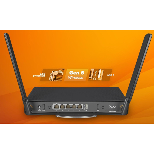 Popis produktu Router do domácností či malých firem s označením hAP ax3 případně C53UiG+5HPaxD2HPaxD má L6 licenci, desktop provedení a obsahuje 5 Gigabitových portů z nichž 1. port podporuje PoE in i PoE out a dokonce i 2.5Gigabit ethernet. Kromě toho má router dvě rádiové části s podporou 802.11a/b/g/n/ac/ax standardů umožňující současný provoz v obou pásmech a dvě odnímatelné všesměrové antény. V pásmu 2,4 GHz je podporováno 2×2 MIMO s přenosovou rychlostí až 574 Mbps a v pásmu 5 GHz 2×2 MIMO s přenosovou rychlostí 1200 Mbps. Zisk dvou odnímatelných bezdrátových antén je 3.3 dBi (2.4 GHz) a 5.5 dBi (5 GHz). Klíčové vlastnosti (1) 2.5 Gigabit ethernet + (4) Gigabit ethernet Podpora PoE in/out na 1. portu 1800 MHz CPU - 4 jádra, ARM 64bit achritektura 128MB NAND, 1GB RAM Wi-Fi - 2,4 GHz (2×2 MIMO, 574 Mbps, 802.11ax), 5 GHz (2×2 MIMO, 1200 Mbps, 802.11ax) Podpora WPA3 šifrování RouterOS level 6 (2) odnímatelné antény, 5.5 dBi zisk Standard 802.11ax zvyšuje rychlost až o 40 % v pásmu 5 GHz a až o 90 % v pásmu 2,4 GHz Obsah balení Zařízení (2) Anténa Napájecí adaptér 24 V/1,5 A Plastový stojánek + šroubky Technické parametry Bezdrátové vlastnosti Bezdrátové frekvence:2.4 + 5 GHz (dual band) WiFi standardy:802.11ac, 802.11ax, 802.11n, 802.11a, 802.11b/g MU-MIMO:Ano Přenosová rychlost - 5GHz [Mb/s]:1200 Přenosová rychlost - 2.4GHz [Mb/s]:574 Vysílací výkon 2.4GHz [dBm]:27 Vysílací výkon 5GHz [dBm]:28 Šifrování:WPA, WPA2, WPA3 2.4GHz MIMO:2 x 2 5GHz MIMO:2 x 2 Typ antény:Odnímatelná Počet odnímatelných antén:2 Zisk antény [dBi]:3,3, 5,5 Konektory a rozhraní Počet portů USB 3.0:1 VF konektory:(2) RSMA female Rychlost LAN:(1) 1G/2.5Gbps + (4) 10/100/1000Mbps Gigabit LAN:Ano USB:Ano Napájení Napájení přes PoE:18 .. 28V DC Typy PoE:PoE-Out + PoE-In Počet PoE Out portů:1 PoE budget [W]:15 Max. spotřeba energie [W]:15 Napájení přes konektor/svorkovnici:12 .. 28V DC Fyzické charakteristiky Provedení:Desktop Použití:Vnitřní Provozní teplota [°C]:-40 až 70 Šířka [mm]:251 Výška [mm]:39 Hloubka [mm]:130 Hardware CPU:IPQ-6010 Frekvence CPU [MHz]:1800 Počet CPU jader:4 Interní uložiště [MB]:128 RAM [MB]:1024 Software Operační mód:AP Router Operační systém:RouterOS - L6 Podpora IPv6:Ano Výchozí IP adresa:192.168.88.1 Výchozí jméno a heslo:admin / -.