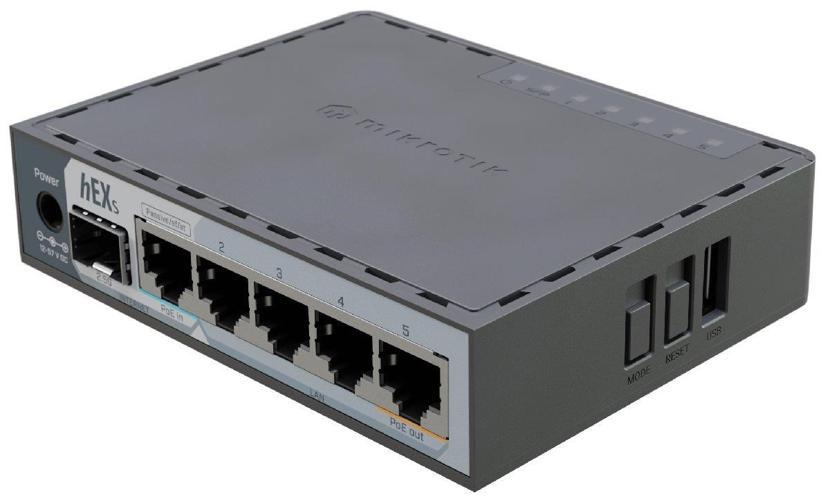 Popis produktu MikroTik hEX S je kompaktní, výkonný a cenově dostupný drátový router, který je ideální volbou pro chytré domácnosti nebo menší kanceláře. Zařízení nabízí 5 Gigabitových ETH portů, přičemž Ether1 podporuje PoE-in a Ether5 PoE-out, což umožňuje napájení dalšího zařízení přímo z routeru. Výstupní napětí na PoE-out portu odpovídá vstupnímu napájení routeru. Hlavní předností je ale 2.5G SFP port, díky kterému lze plně využít potenciál rychlého připojení – například k NAS serveru nebo optické síti poskytovatele. Router lze napájet přes DC konektor 12-57V, přes PoE-in v rozmezí 18-57V nebo standardu 802.3af/at. Skvělý hardware i software Uvnitř se nachází dvoujádrový ARM procesor s taktem 950 MHz a 512 MB RAM, což poskytuje dostatek výkonu pro náročnější úlohy. Operační systém RouterOS v7 otevírá možnosti jako jsou VLANy, bonding, traffic shaping, pokročilé routování a další funkce bez nutnosti dokupovat licence nebo funkční rozšíření. Obsah balení • Zařízení • Napájecí adaptér 24V / 1,2A Technické parametry Konektory a rozhraní Možnost více WAN:Ano Rychlost LAN:(5) 10/100/1000Mbps Gigabit LAN:Ano Optické rozhraní:(1) 1G/2.5Gbps USB:Ano Napájení Napájení přes PoE:802.3af, 802.3at, 18 .. 57V DC Typ napájení:DC konektor, PoE Typy PoE:PoE-Out + PoE-In Počet PoE Out portů:1 Max. spotřeba energie [W]:5 Napájení přes konektor/svorkovnici:12 .. 57V DC Fyzické charakteristiky Provedení:Na zeď, Desktop Ventilátory:Ne Šasi:Plastové Tlačítka:Reset Provozní teplota [°C]:-40 až 70 Šířka [mm]:113 Výška [mm]:28 Hloubka [mm]:89 Hardware CPU:EN7562CT Frekvence CPU [MHz]:950 Počet CPU jader:2 Interní uložiště [MB]:128 RAM [MB]:512 Software Podporované VPN:PPTP, L2TP, IPSec, OpenVPN, WireGuard, ZeroTier, GRE Management:Webové rozhraní, SSH, Telnet, Winbox Operační systém:RouterOS v7 - L4 Podpora IPv6:Ano Výchozí IP adresa:192.168.88.1 Výchozí jméno a heslo:admin / (přednastavené heslo, viz samolepka/rytina).