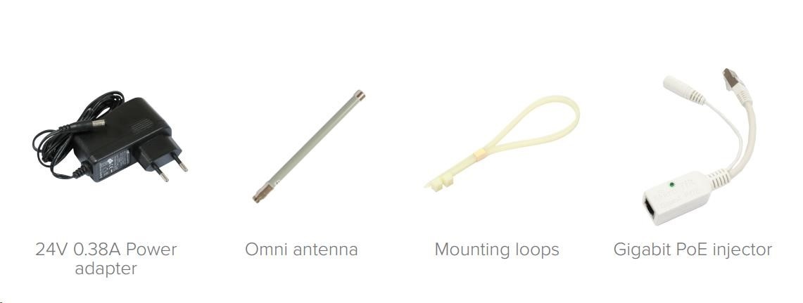 Balení obsahuje: RouterBOARD RBGrooveGA-52HPacn, PoE injektor, napájecí zdroj, montážní sada, anténa 6dBi omni