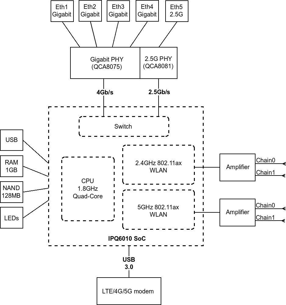 Popis produktu Chateau LTE18 ax je Dual Band 2.4/5GHz Wi-Fi 6 router do domácnosti či malých firem s (4) Gigabit LAN + (1) 2.5-Gigabit porty, LTE18 modemem, jedním USB portem, L4 licencí a extra rychlým 4-jádrovým ARM CPU s taktem 1800 MHz, vnitřním uložištěm 128 MB a 1 GB RAM. Uživatel tak může souběžně používat 2.4GHz kanál pro asociovaná mobilní bezdrátová zařízení a 5GHz kanál mít vyhrazen např. pro TV streamování videa. Modulační rychlost 2.4GHz rádiové části (2x2 MIMO) je 574 Mbps a pro 5GHz (2x2 MIMO) je to 1200 Mbps. Chateau LTE18 ax disponuje čtyřmi vestavěnými anténami pro LTE, dvěmi SMA female konektory pro případný vylepšení LTE dosahu pomocí externích antén a dvěmi anténami pro Wi-Fi, které jsou součástí balení. V případě modelu Chateau LTE18 ax již nadále nemusíte být limitováni kabeláží - výhodou tohoto modelu je velmi široká podpora kanálů v 3G/LTE sítí. Tento LTE router poskytuje rychlost až 1 200 Mbps (download) a 150 Mbps upload s nízkými latencemi v LTE. Obsah balení Zařízení (2) Wi-Fi anténa Napájecí adaptér 24V / 1.2A UTP patch kabel - 1,5m Technické parametry Bezdrátové vlastnosti Bezdrátové frekvence:2.4 + 5 GHz (dual band), 3G (GSM), LTE WiFi standardy:802.11ax, 802.11ac, 802.11n, 802.11a, 802.11b/g Přenosová rychlost - 5GHz [Mb/s]:1201 Přenosová rychlost - 2.4GHz [Mb/s]:574 Vysílací výkon 2.4GHz [dBm]:20 Vysílací výkon 5GHz [dBm]:21 Šifrování:WPA, WPA2, WPA3 2.4GHz MIMO:2 x 2 5GHz MIMO:2 x 2 Typ antény:Vestavěná, Odnímatelná Počet vestavěných antén:4 Počet odnímatelných antén:4 Zisk antény [dBi]:3, 6 Integrovaná 4G/LTE rádiová část:Ano Podporované 4G/LTE kanály:(1) 2100 MHz, (3) 1800 MHz, (5) 850 MHz, (7) 2600 MHz, (8) 900 MHz, (20) 800 MHz, (28) 700 MHz, (38) 2600 MHz, (40) 2300 MHz, (41) 2500 MHz Konektory a rozhraní Počet portů USB 2.0:1 VF konektory:(2) RSMA female, (2) SMA female Rychlost LAN:(1) 1G/2.5Gbps + (4) 10/100/1000Mbps Gigabit LAN:Ano Slot na SIM kartu:Ano Počet SIM slotů:1 USB:Ano Napájení Max. spotřeba energie [W]:16 Napájení přes konektor/svorkovnici:12 .. 28V DC Fyzické charakteristiky Provedení:Desktop Použití:Vnitřní Tlačítka:Reset, mód Provozní teplota [°C]:-40 až 65 Šířka [mm]:240 Výška [mm]:156 Hloubka [mm]:44 Hardware CPU:IPQ-6010 Frekvence CPU [MHz]:1800 Počet CPU jader:4 Interní uložiště [MB]:128 RAM [MB]:1024 Software Operační mód:AP Router, Access Point, 3G/4G Router Operační systém:RouterOS - L4 Podpora IPv6:Ano Výchozí IP adresa:192.168.88.1 Výchozí jméno a heslo:admin / -.