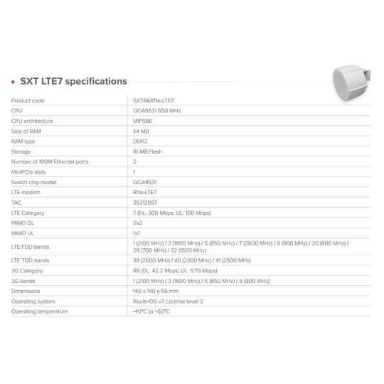 Robustní venkovní LTE CPE s novým modemem R11e-LTE7 poskytuje stabilní a rychlý internet. Řešení pro lokality, kde telefony selhávají – ideální pro farmy, připojení mimo síť a venkovské nemovitosti. Nyní s lepším uplinkem, PoE vstupem i výstupem a širokým rozsahem napájení 12–57 V. Namontujte, připojte a zůstaňte online S rychlejším uploadem. S nižšími latencemi. Stejný osvědčený decentní design SXT, který zůstává skrytý na první pohled. Proč upgradovat na CAT7? • Dvojnásobná rychlost uploadu • Rozšířená podpora frekvencí – nyní zahrnuje pásmo 32 (1500 MHz) pro ještě lepší výkon v přetížených oblastech. • Stejný osvědčený design – žádné změny v instalaci nebo konfiguraci. • Nižší náklady – lepší konektivita, která ve skutečnosti stojí méně. Všechna nová zařízení CAT7 také podporují 2×2 MIMO DL a agregaci pásem. To znamená, že mohou současně využívat více pásem LTE. To je obrovská výhoda, když je v dané oblasti mnoho mobilních uživatelů. Nabízí lepší odezvu v přeplněném prostředí, vyšší účinnost v situacích se slabším signálem. Po zapnutí agregace pásem jsme zaznamenali zdvojnásobení rychlosti internetu ve venkovských oblastech. Součástí dodávky: - 1x outdoor jednotka RBSXT - 1x montážní příprava k uchycení jednotky na stožár/konzoli - 1x 24V 1.2A napájecí zdroj - 1x POE injektor - 1x teplovodivá chladící podložka Technické specifikace: Product code: SXTR&R11e-LTE7 CPU: QCA9531 650 MHz CPU: architecture MIPSBE Size of RAM: 64 MB RAM type: DDR2 Storage: 16 MB Flash Number of 100M Ethernet ports: 2 MiniPCIe slots: 1 Switch chip model: QCA9531 LTE modem: R11e-LTE7 TAC: 35312597 LTE Category: 7 (DL: 300 Mbps; UL: 100 Mbps) MIMO DL: 2x2 MIMO UL: 1x1 LTE FDD bands: 1 (2100 MHz) / 3 (1800 MHz) / 5 (850 MHz) / 7 (2600 MHz) / 8 (900 MHz) / 20 (800 MHz) /28 (700 MHz) / 32 (1500 MHz) LTE TDD bands: 38 (2600 MHz) / 40 (2300 MHz) / 41 (2500 MHz) 3G Category: R8 (DL: 42.2 Mbps; UL: 5.76 Mbps) 3G bands: 1 (2100 MHz) / 3 (1800 MHz) / 5 (850 MHz) / 8 (900 MHz) Dimensions: 140 x 140 x 56 mm Operating system: RouterOS v7, License level 3 Operating temperature: -40°C to +60°C Napájení: DC input: PoE-In PoE-In input Voltage: 12-57 V Power adapter nominal voltage: 24 V Power adapter nominal current: 1.2 A PoE-in: 802.3af/at PoE-Out: Passive PoE up to 57V (Ether2) Max power consumption without attachments: 7 W Max power consumption: 24 W Upozornění: Výrobce Mikrotik neposkytuje záruku na zařízení poškozená přepětím. Zařízení je třeba adekvátně chránit proti indukovanému elektrostatickému přepětí či přepěťovým špičkám na silovém vedení. Pro venkovní instalace používat výhradně stíněnou kabeláž (FTP/SFTP) a jednotky korektně uzemnit (prostřednictvím integrovaného zemnícího členu či použitím ethernetové přepěťové ochrany)..