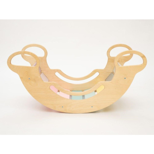 Montessori dětská houpačka smile 6in1 jistě vykouzlí úsměv na tváři vaší holčičky nebo chlapce. Svým designem, pastelovými barvami a širokým úsměvem bude denně lákat děti k zábavné hře i příjemnému pohoupání. Její využití je všestranné, může být houpačkou, skluzavkou, prolézačkou, skrýší i sedačkou, při doplnění oboustranným prknem i dětským nábytkem. Oboustranné prkno není součástí houpačky. Díky jemným pastelovým barvám je vhodná do každého interiér. Vyrobená je z těch nejkvalitnějších materiálů, ručně dohladka opracovaná a lakovaná barvami s atestem. Montessori houpačka smile je širší než naše Montessori houpačky 5in1, proto k této houpačce nabízíme i speciální oboustranné prkno, které je doplňkem k houpačkám smile. Díky prknu snadno proměníte houpačku smile v dětský stoleček. Oboustranné prkno není součástí houpačky, pro využití houpačky jako nábytku je nutné prkno samostatně dokoupit..